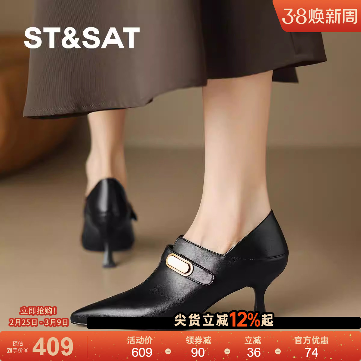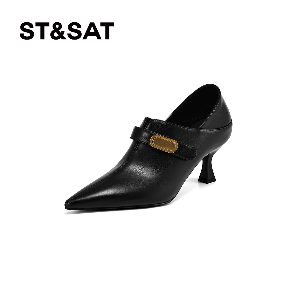 星期六春秋季新款高跟鞋女真皮尖头时尚气质深口细跟拉链皮鞋