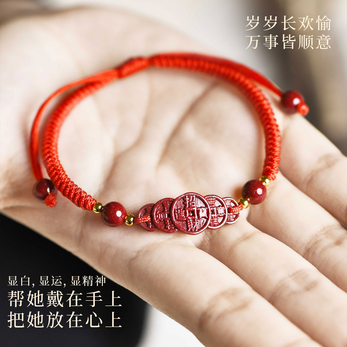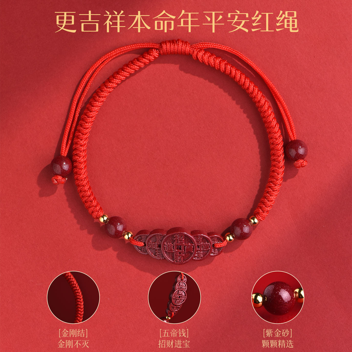 朱砂五帝钱红绳手链马本命年紫金砂手串编织绳红色中性风手绳礼物