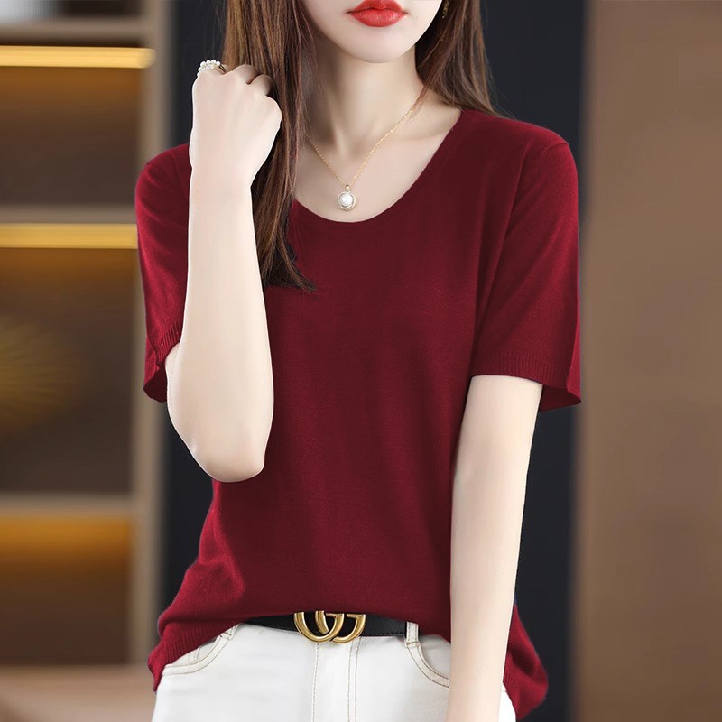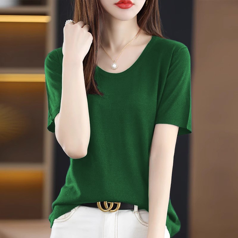 2025新款夏装女士U领短袖针织衫女薄款冰丝t恤上衣洋气显瘦打底衫