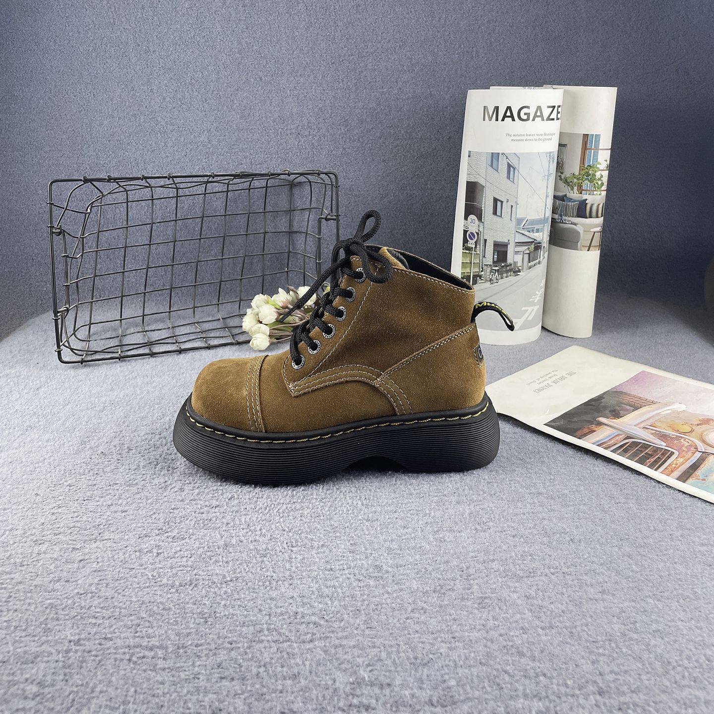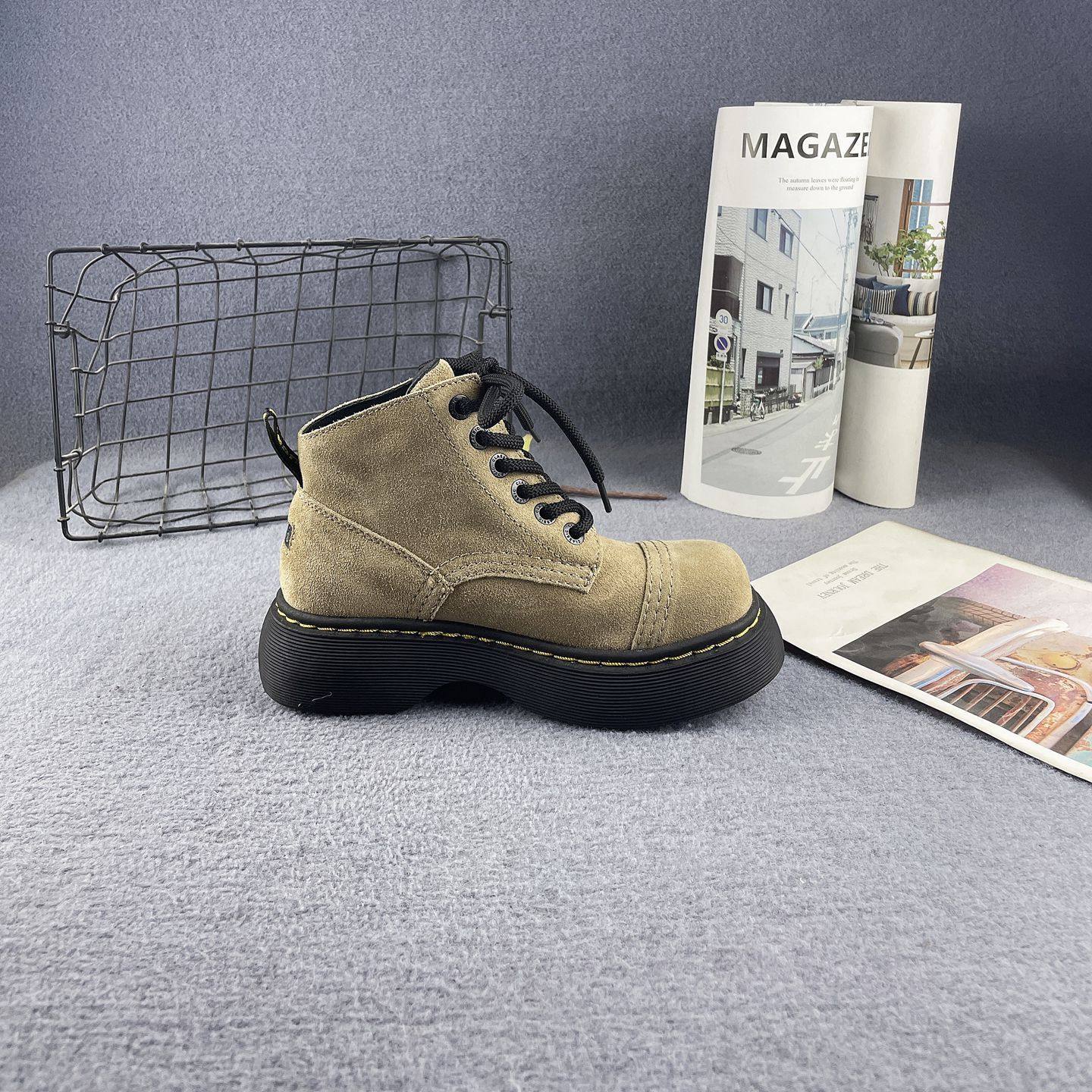 牛皮增高厚底圆头系带时尚马丁靴