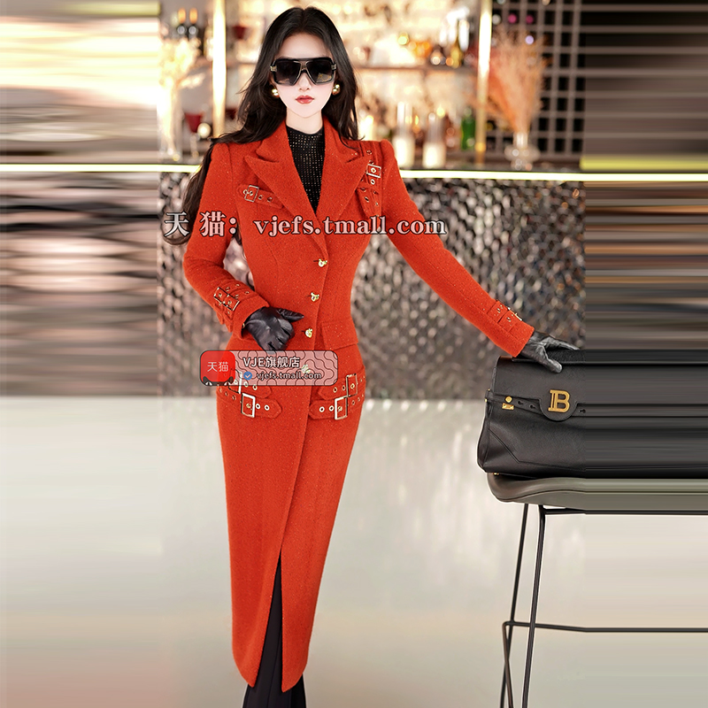 VJEVJE冬装欧美定制呢子大衣新款收腰修身保暖中长款毛呢外套