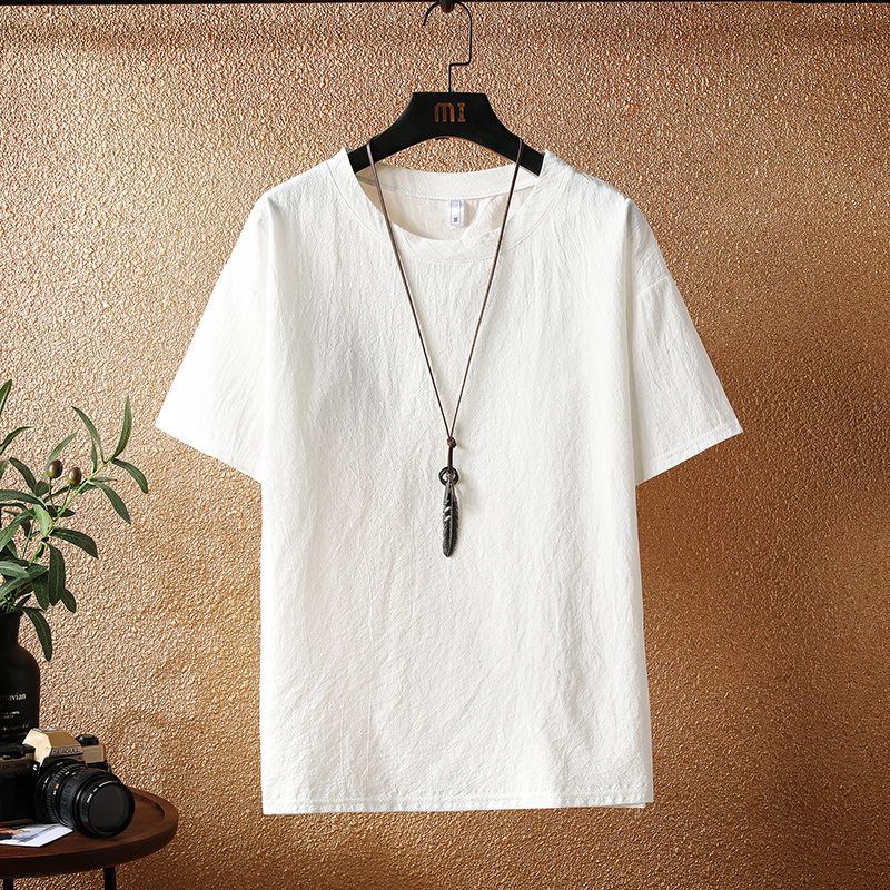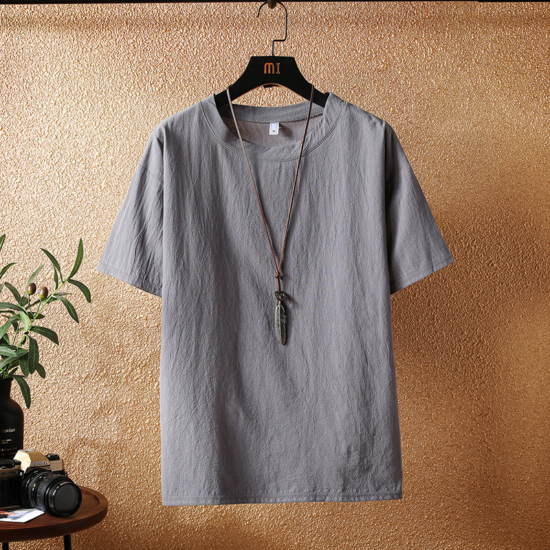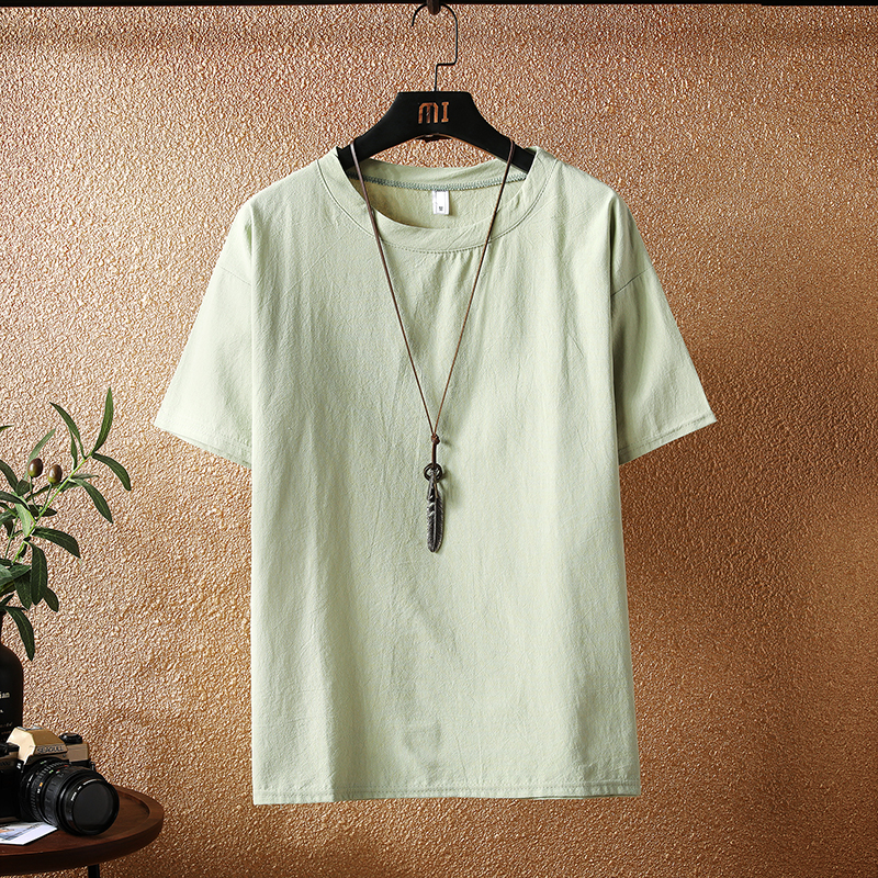 基础款百搭亚麻t恤男夏季薄款中国风棉麻小领口短袖宽松打底上衣