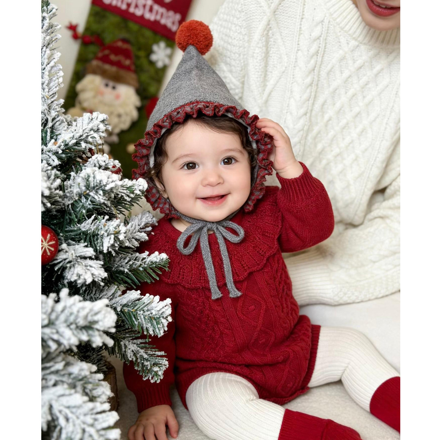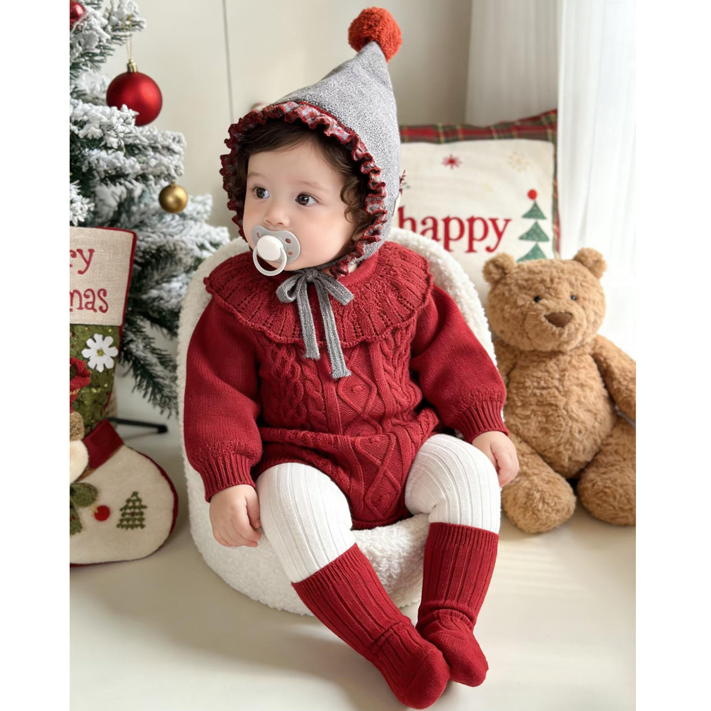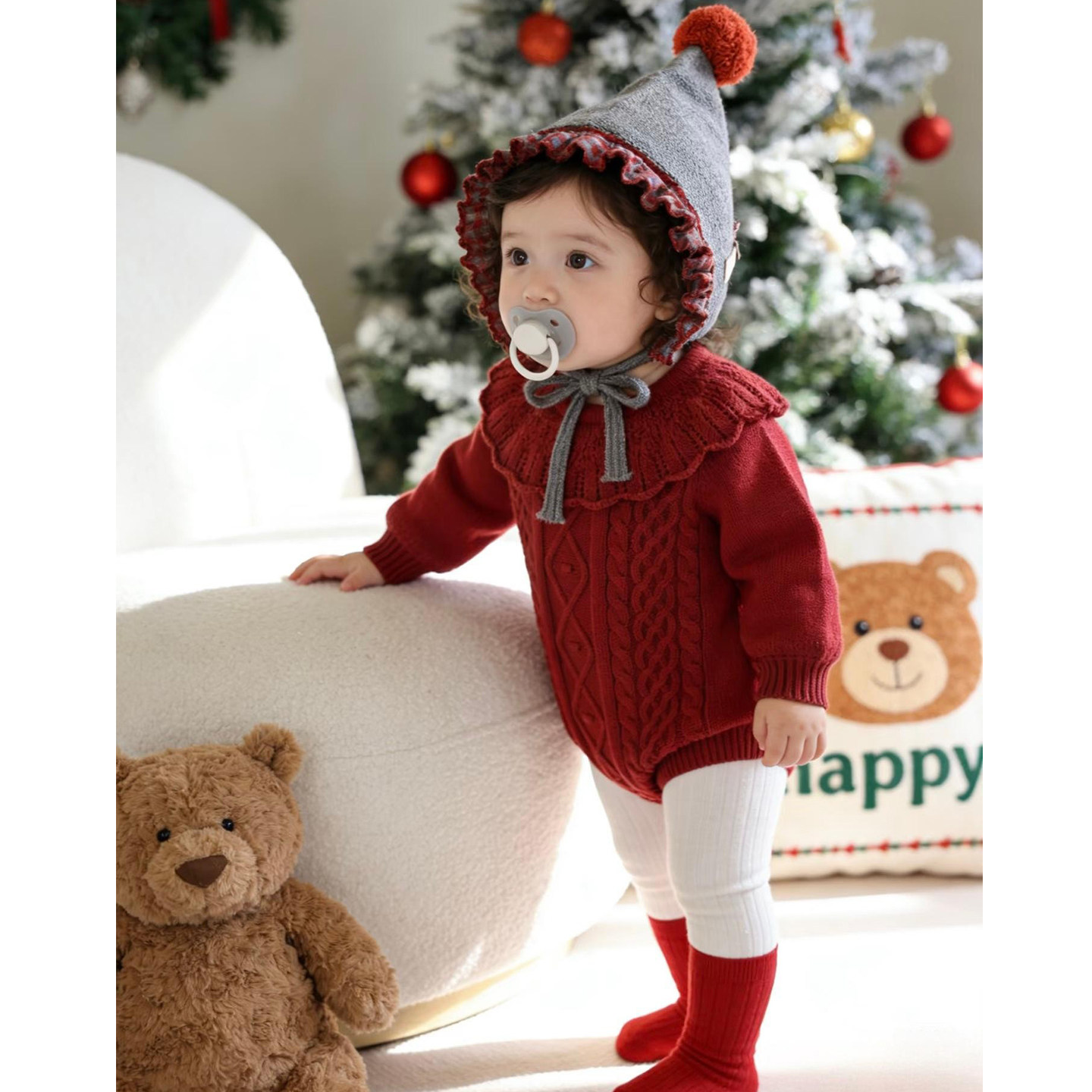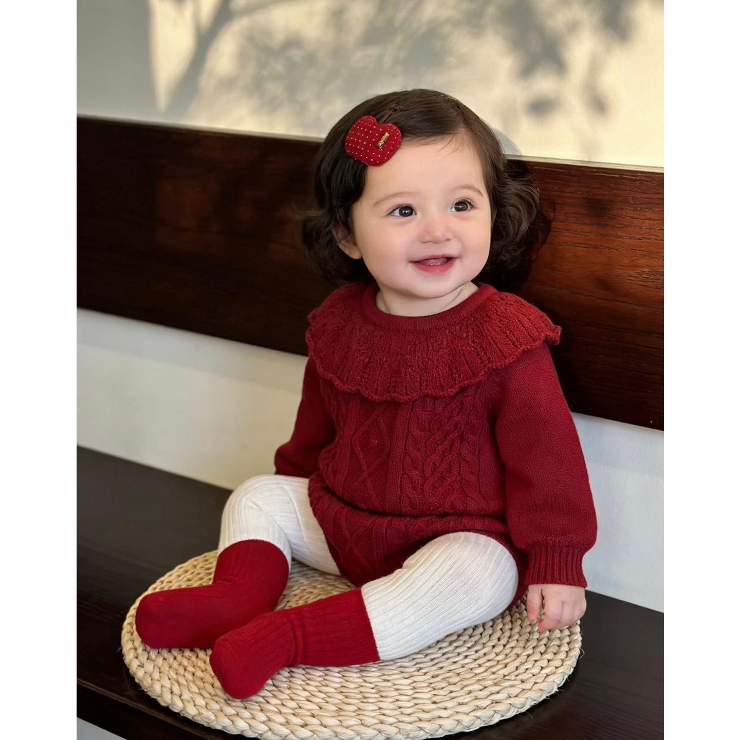 婴幼儿秋冬新款针织包屁衣女宝宝可爱红色毛衣可爱花边领针织爬服