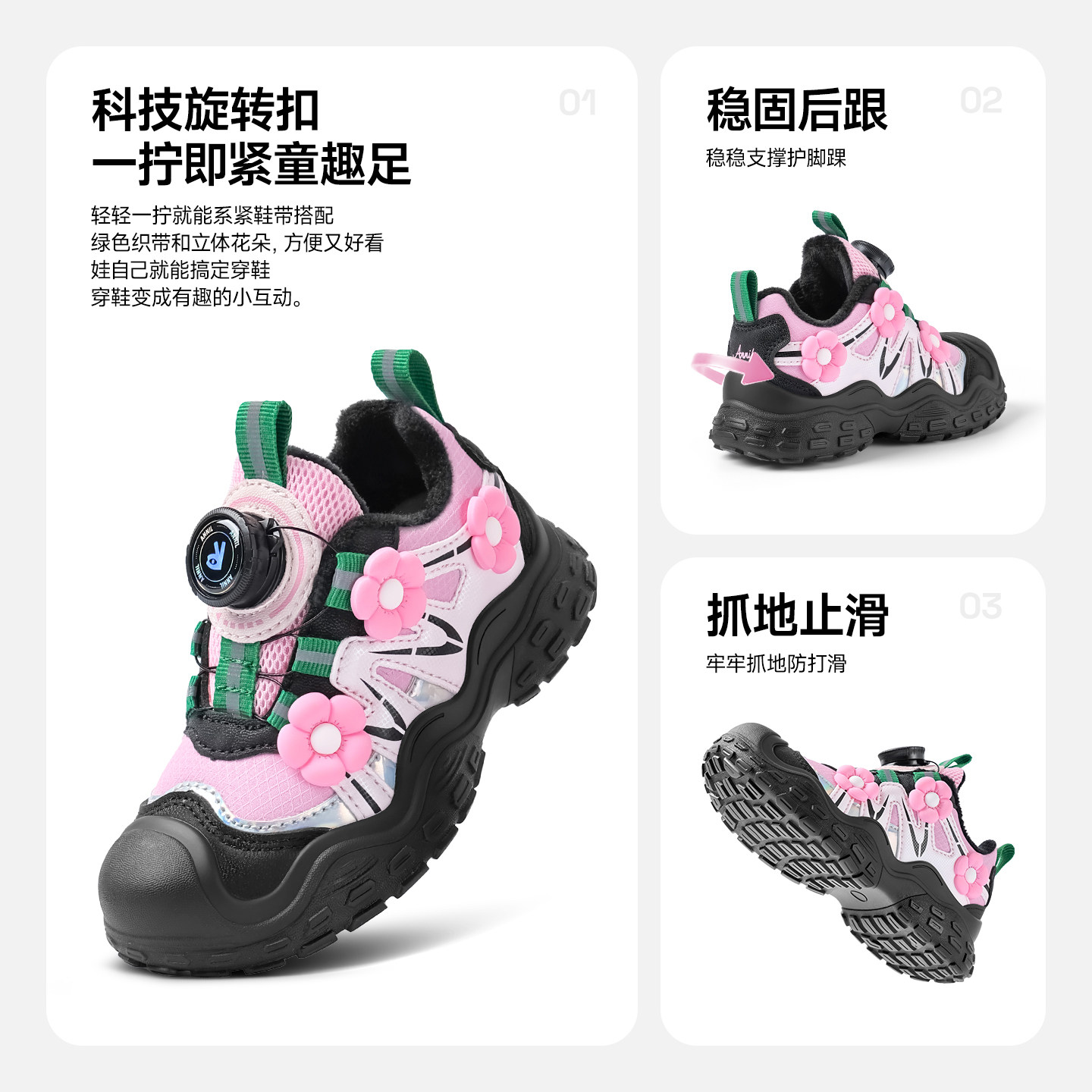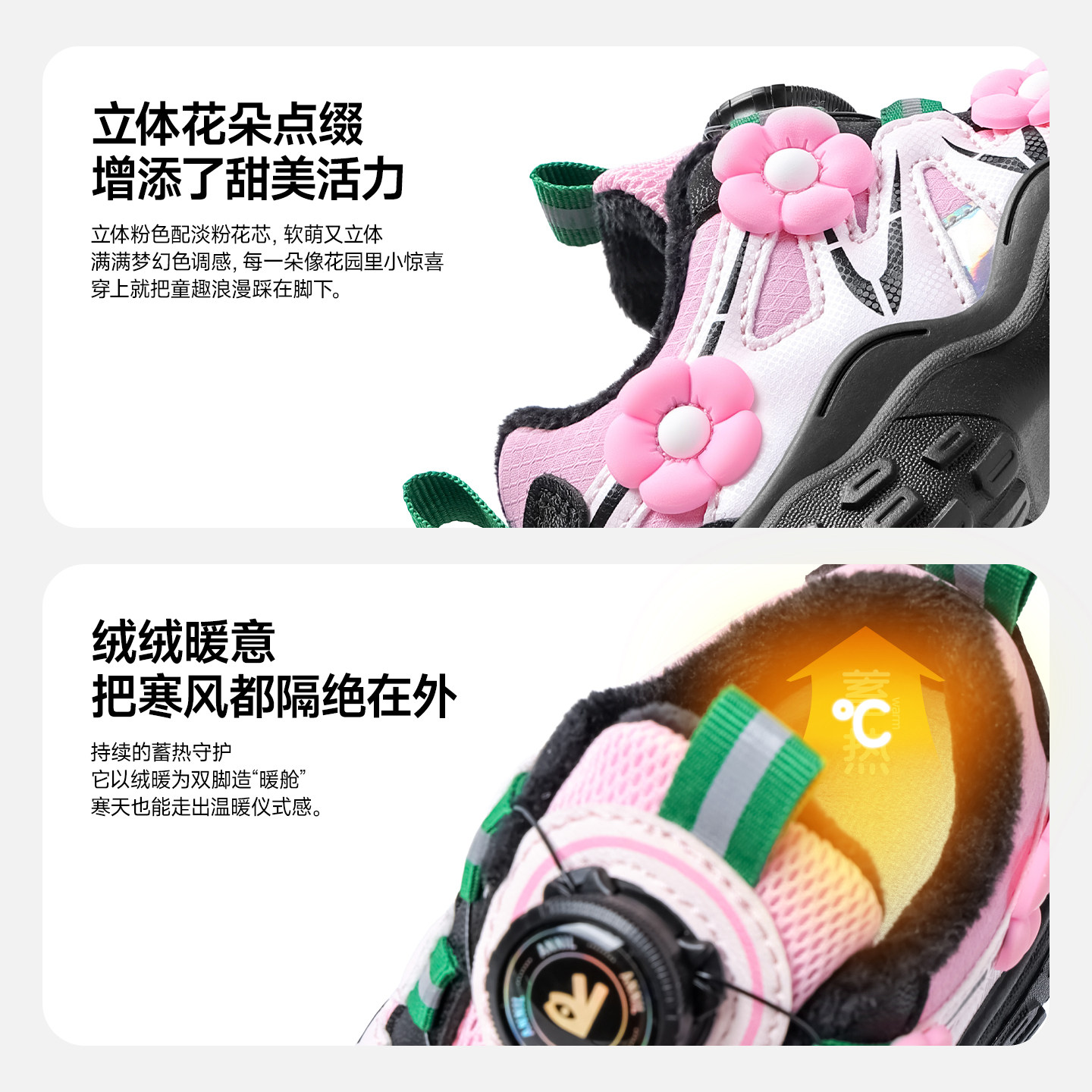 安奈儿女童运动鞋新款秋冬季皮面防水加绒二棉冬鞋儿童鞋子登山鞋