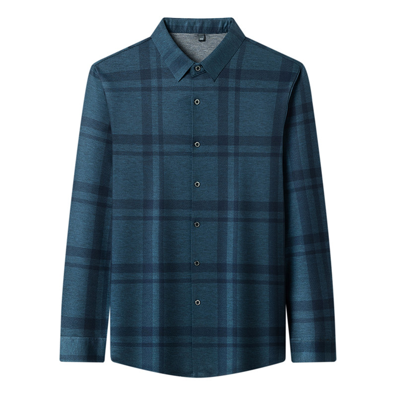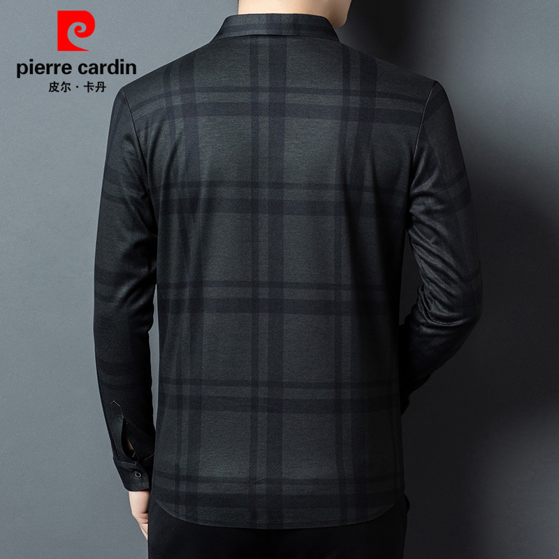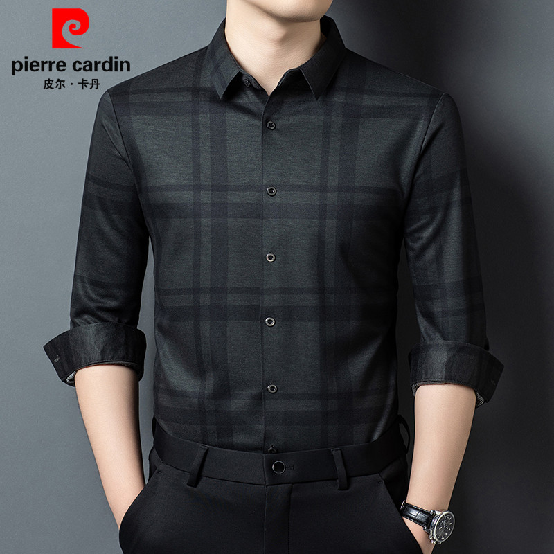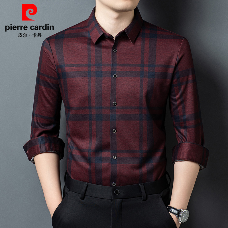 皮尔卡丹春季高档长袖格子羊毛衬衫男士中年商务休闲百搭免烫衬衣