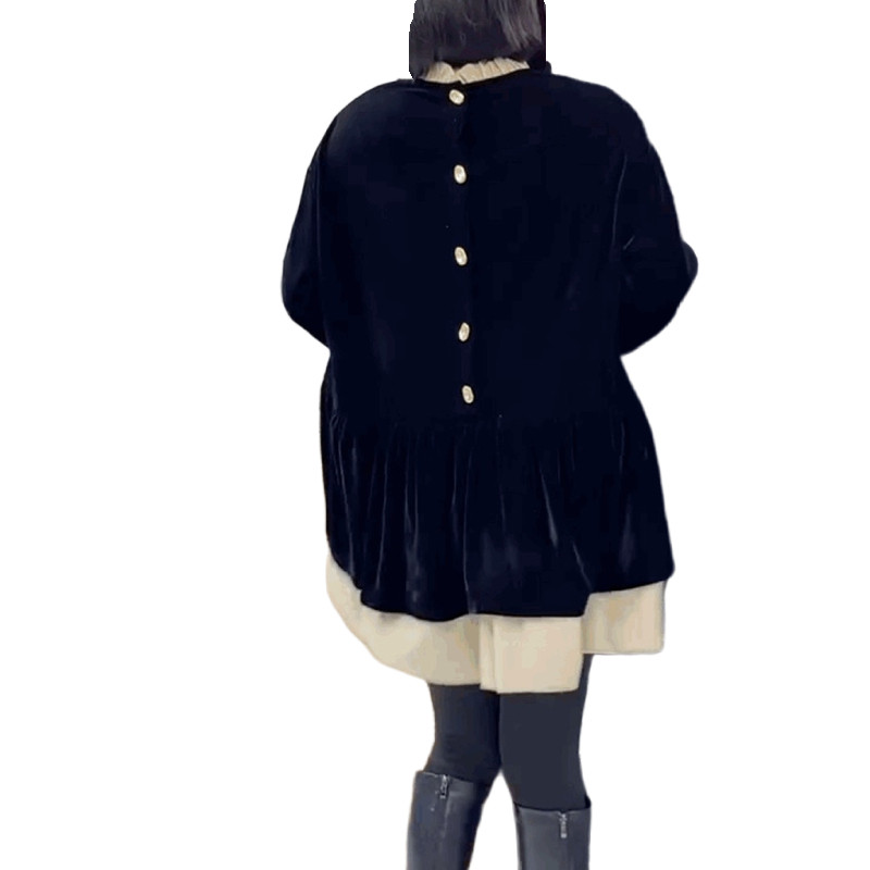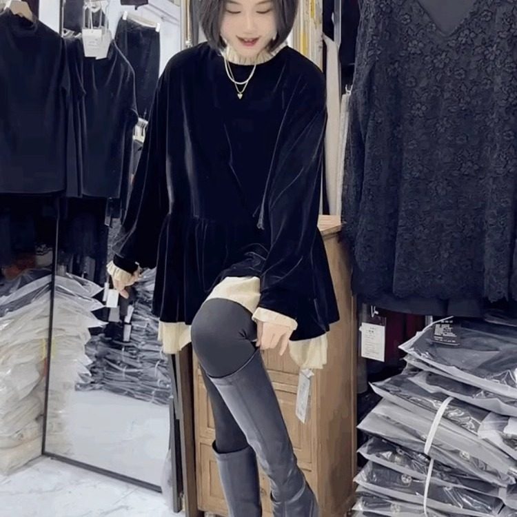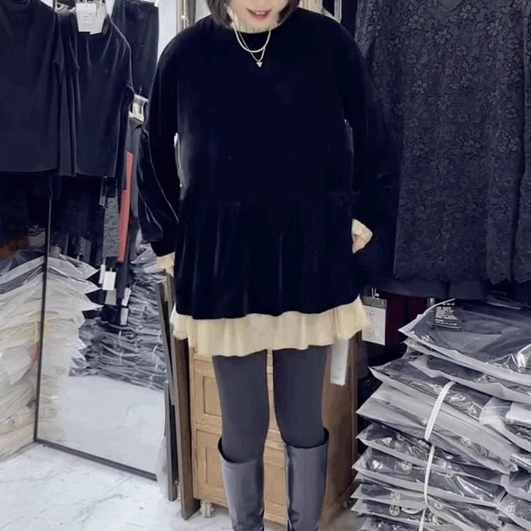 时尚雪纺荷叶边圆领遮臀黑色上衣高端宽松中长款丝绒衬衫大衫裙女
