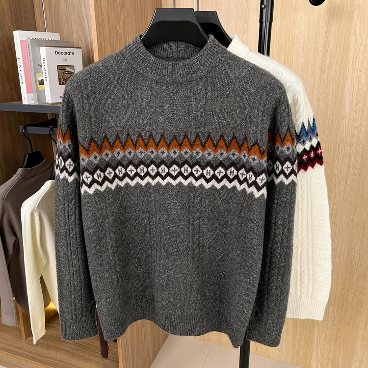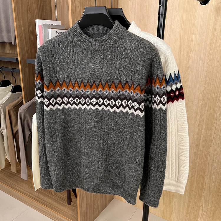 高档纯羊毛衫男冬季加厚款宽松休闲提花圆领保暖针织衫套头毛线衫