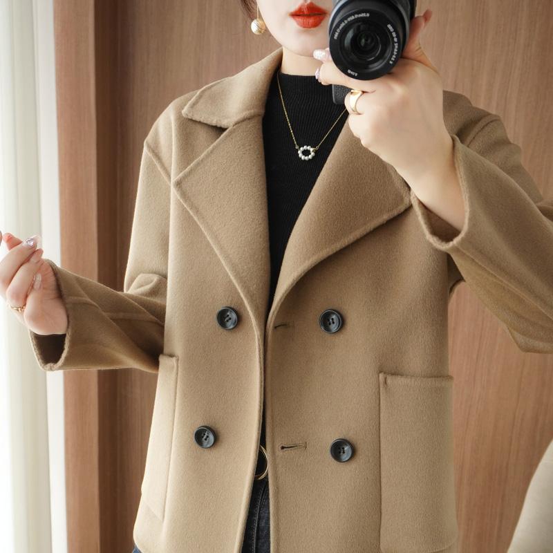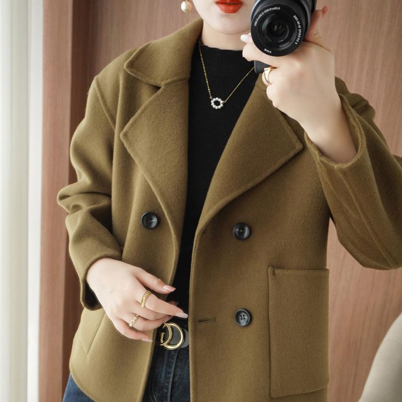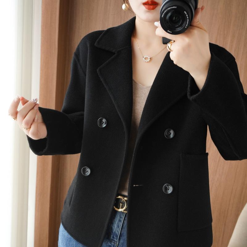 高端西装领双面羊绒大衣女短款小个子宽松羊毛呢外套新年红呢子