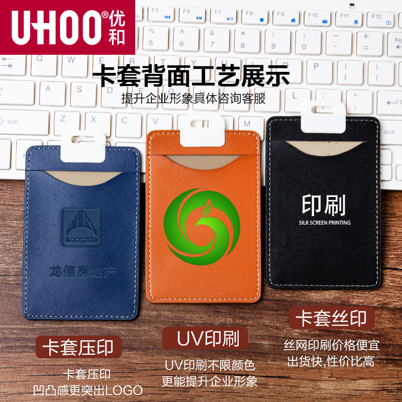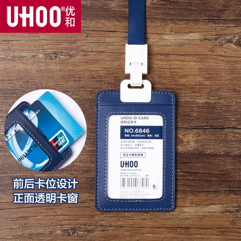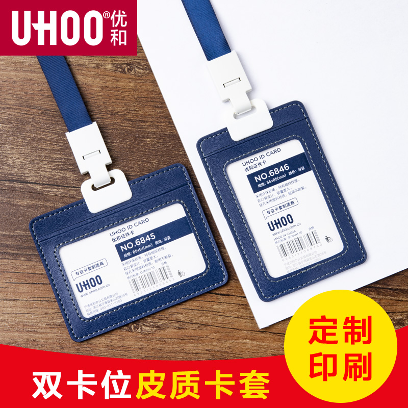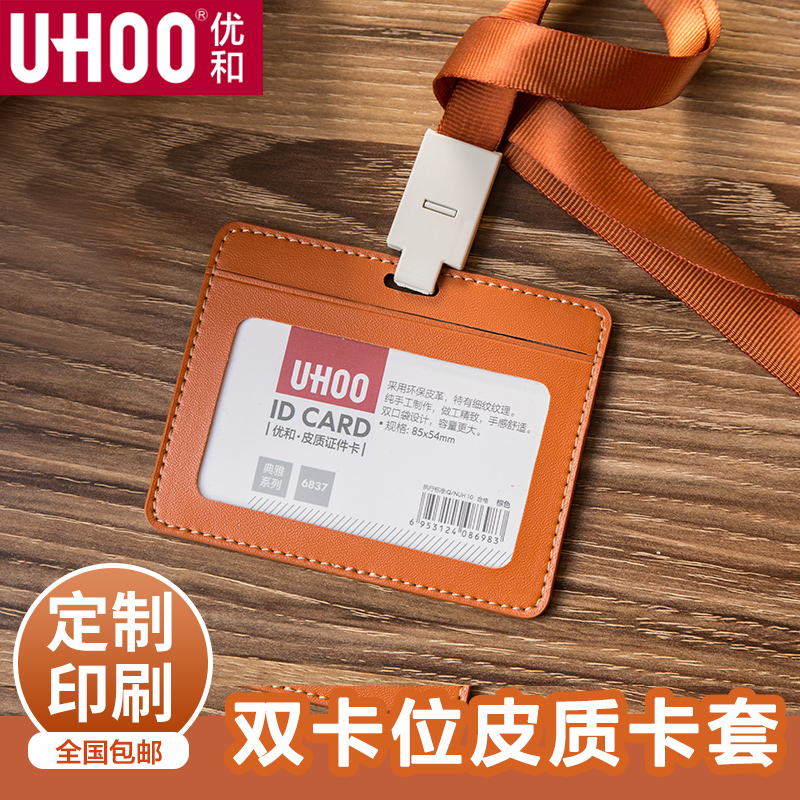 UHOO优和可放双卡皮质工作证卡套胸牌带挂绳卡套门禁证件保护套公交卡饭卡可定制皮卡套银行员挂绳定制卡套