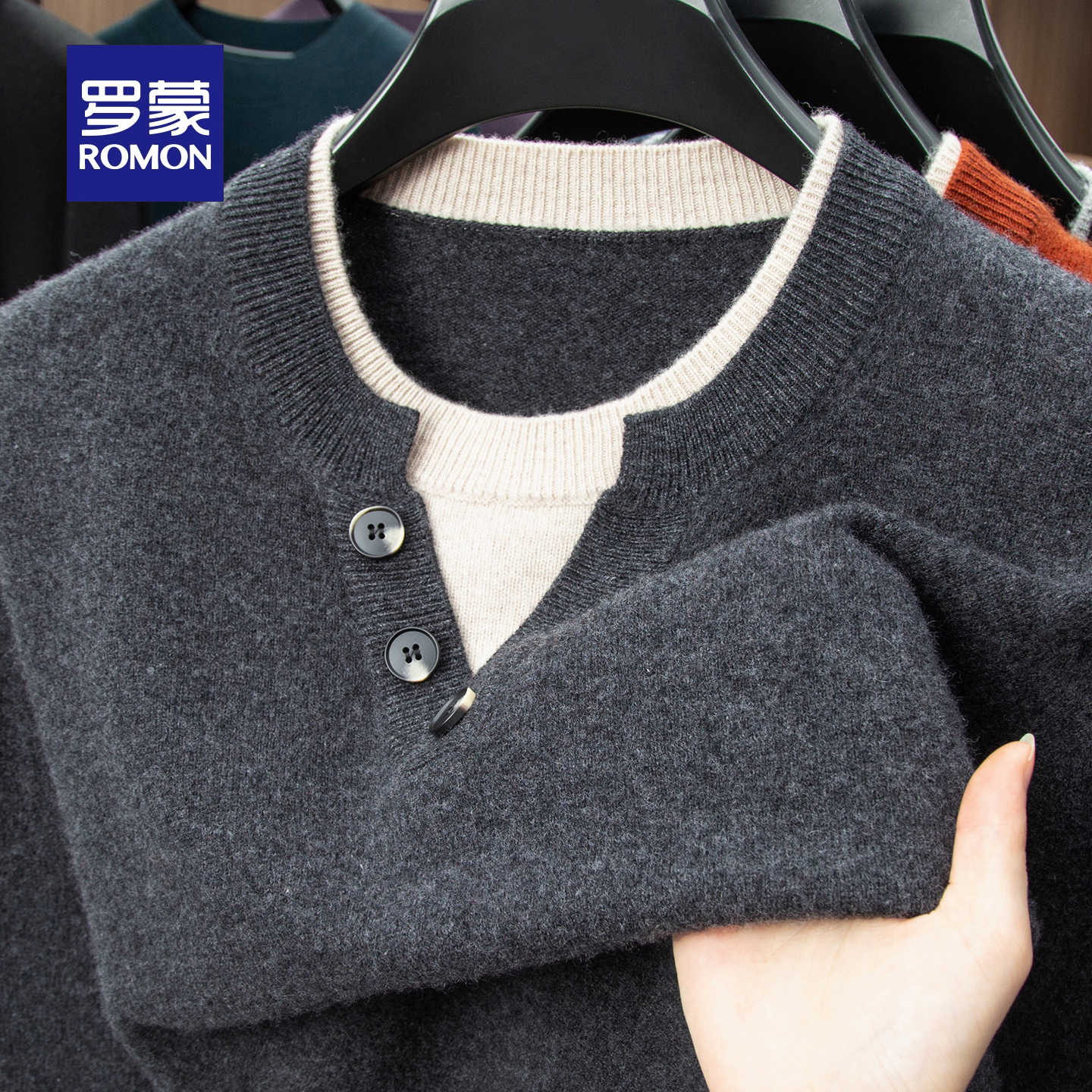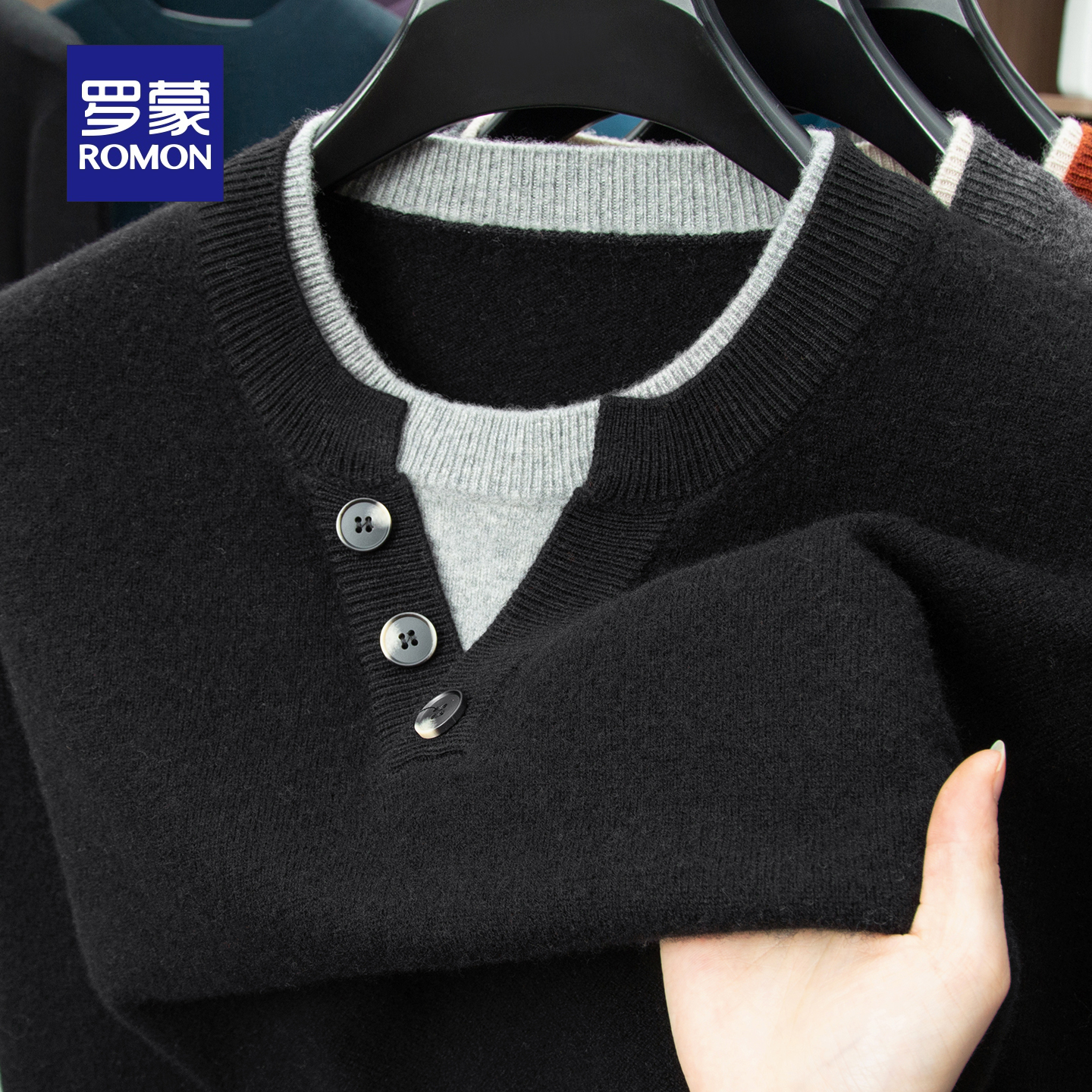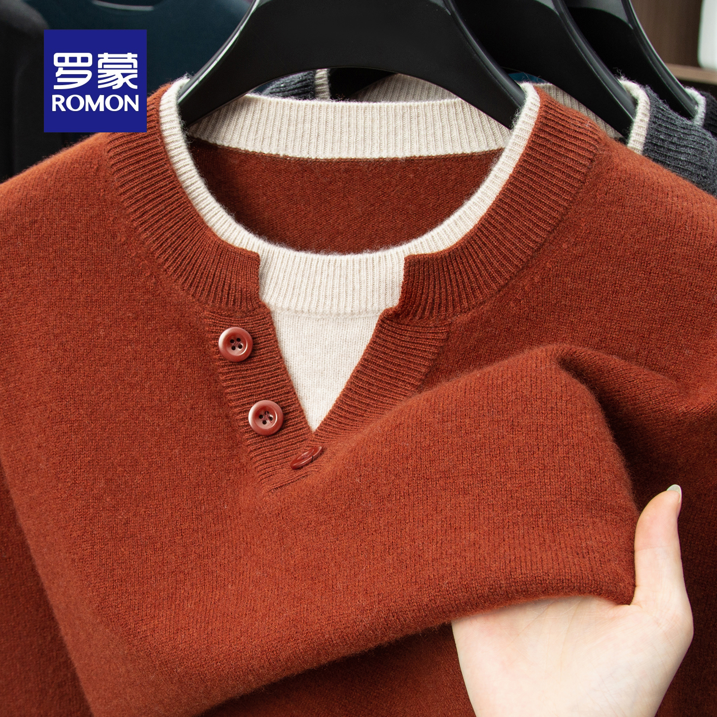 羊绒+羊毛罗蒙男士时尚休闲假两件羊毛衫秋冬新款撞色V领针织衫MF