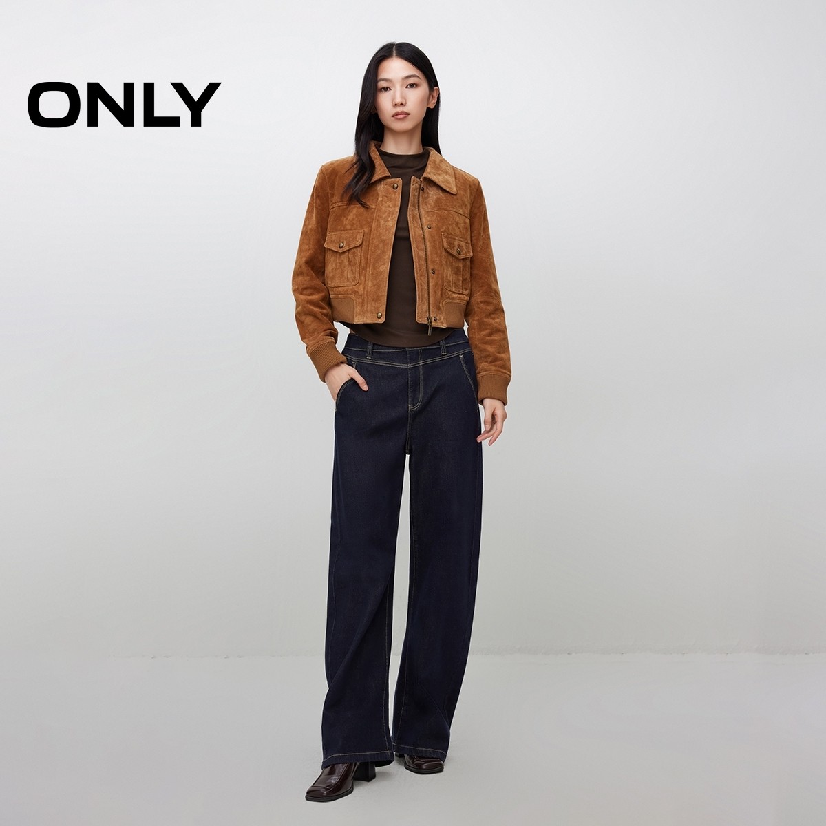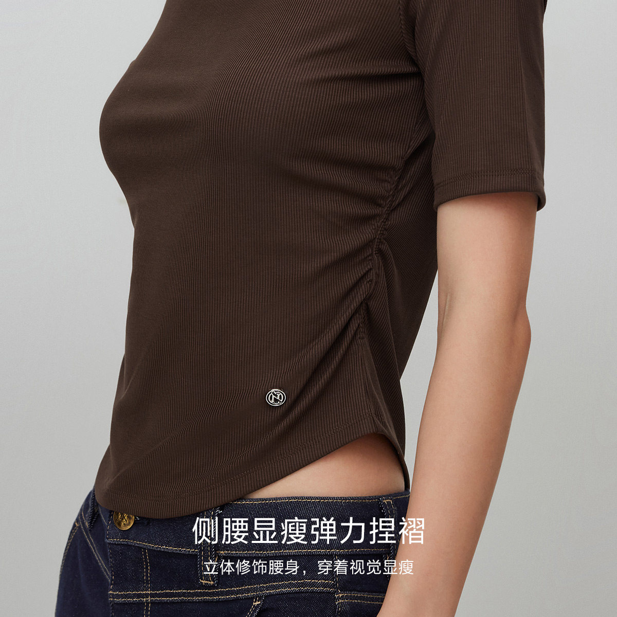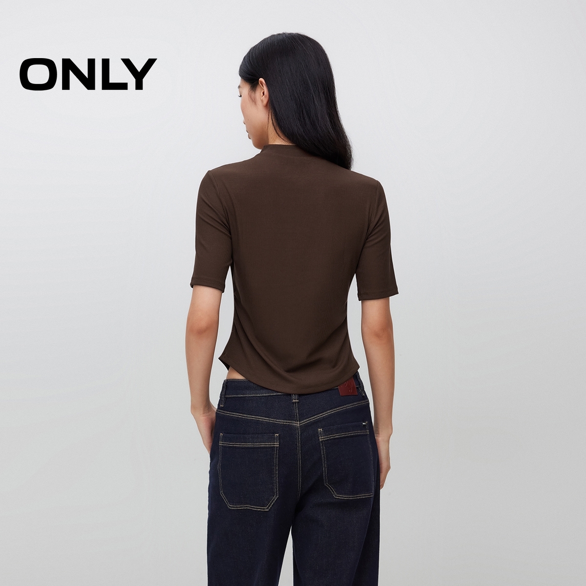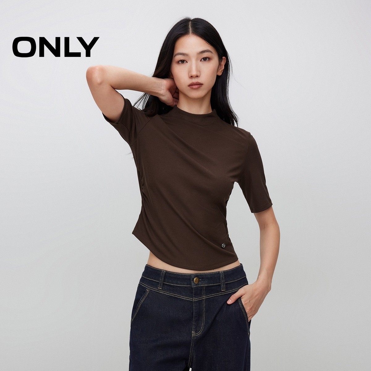 ONLY2025秋季新款侧腰褶皱设计正肩小高领短袖纯色短款针织T恤女