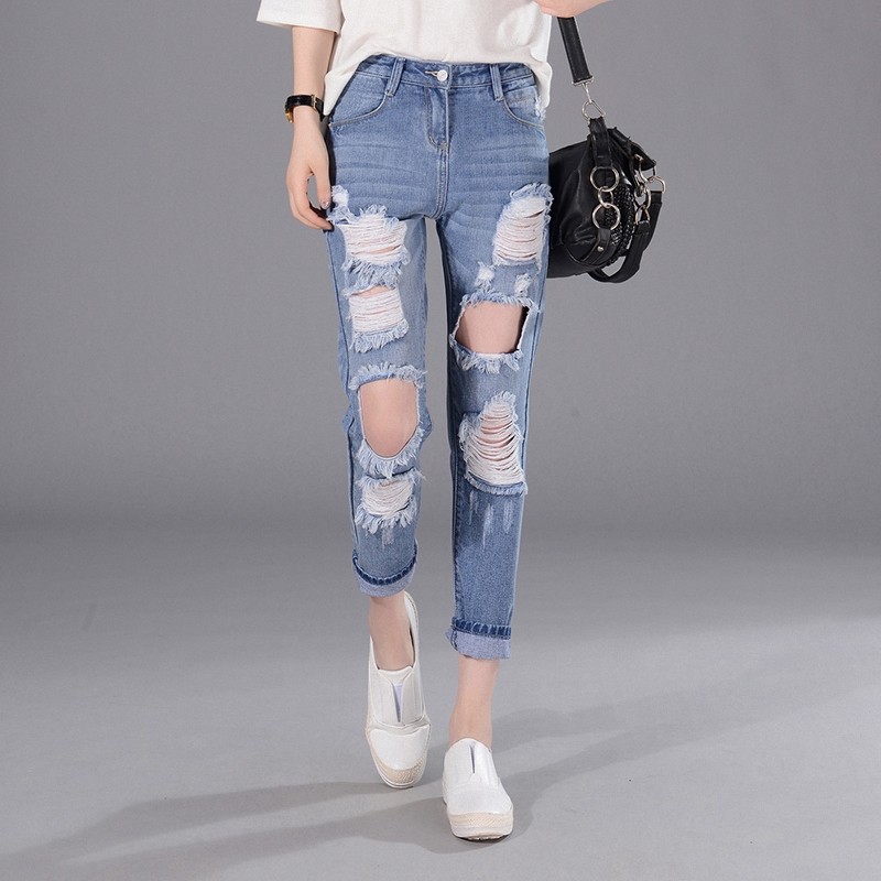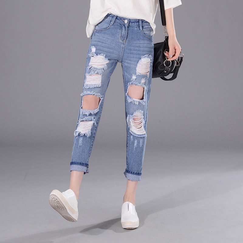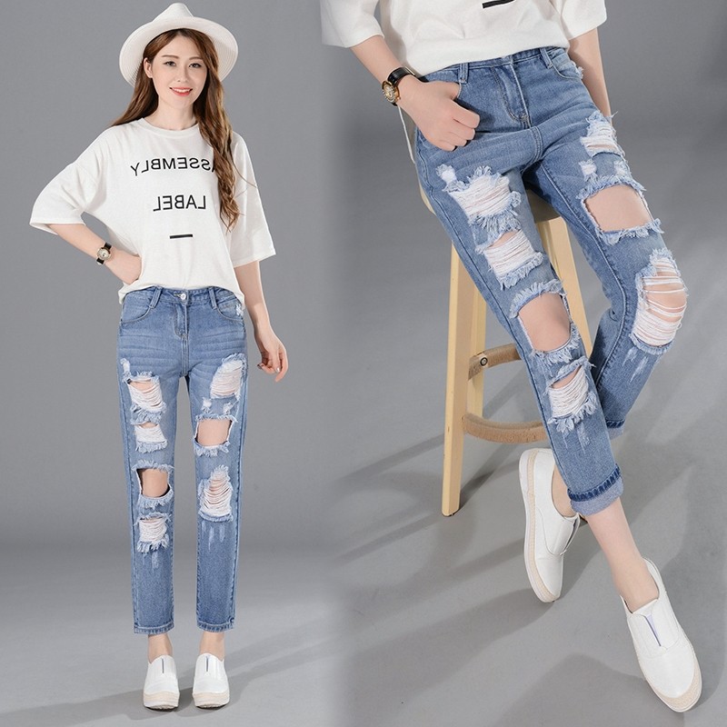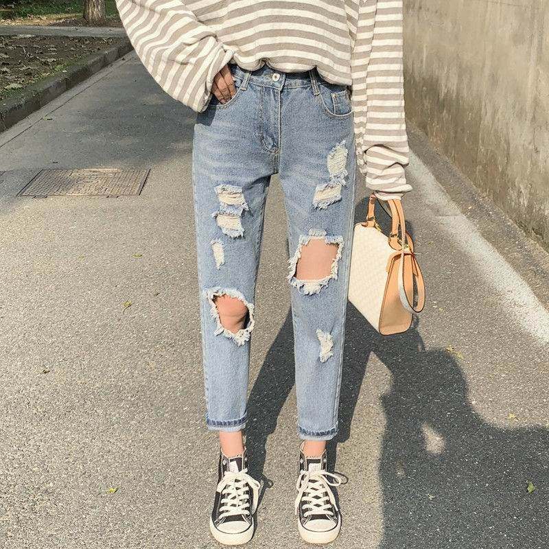 2025春夏新款哈伦破洞牛仔裤女时尚宽松九分裤BF风高腰显瘦萝卜裤