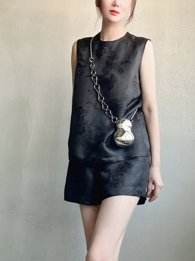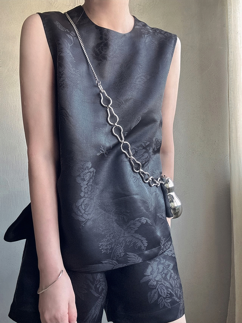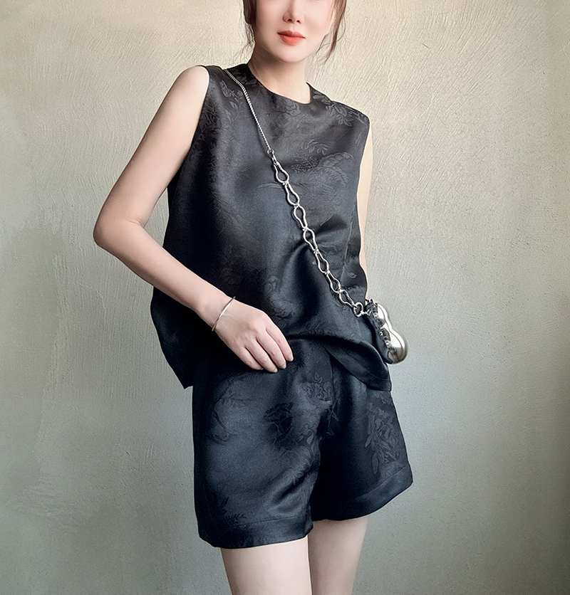 缓圆原创香云纱真丝提花无袖背心上衣橡筋短裤气质显瘦套装女24夏