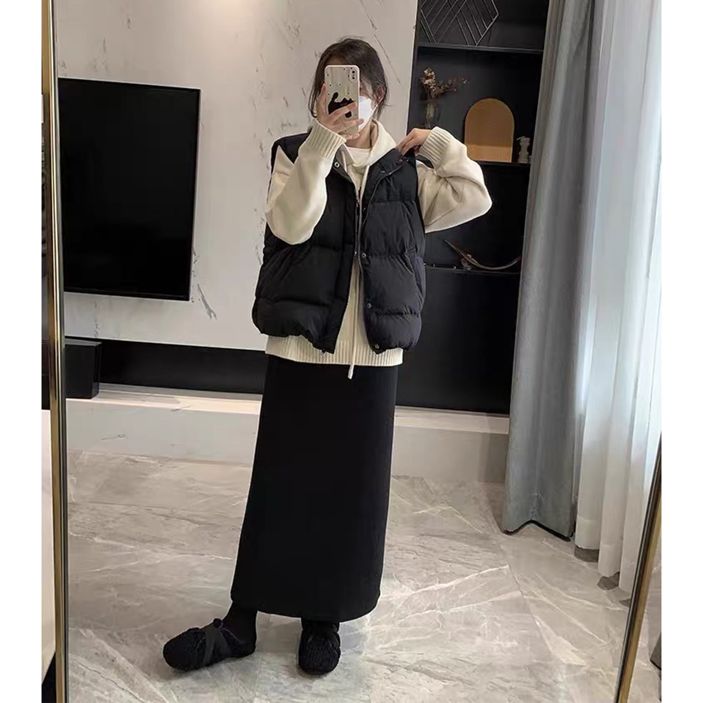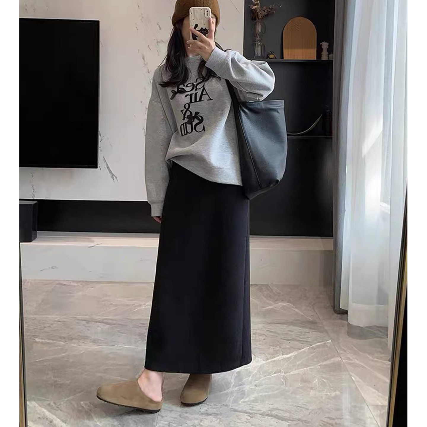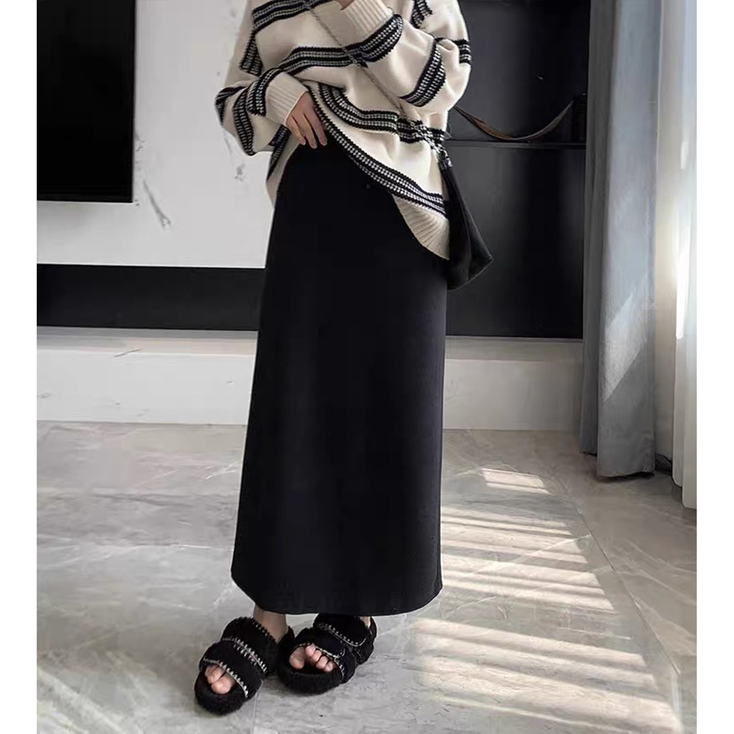 黑色醋酸羊毛呢半身裙女秋冬季直筒高腰显瘦大码极简风开叉中长裙