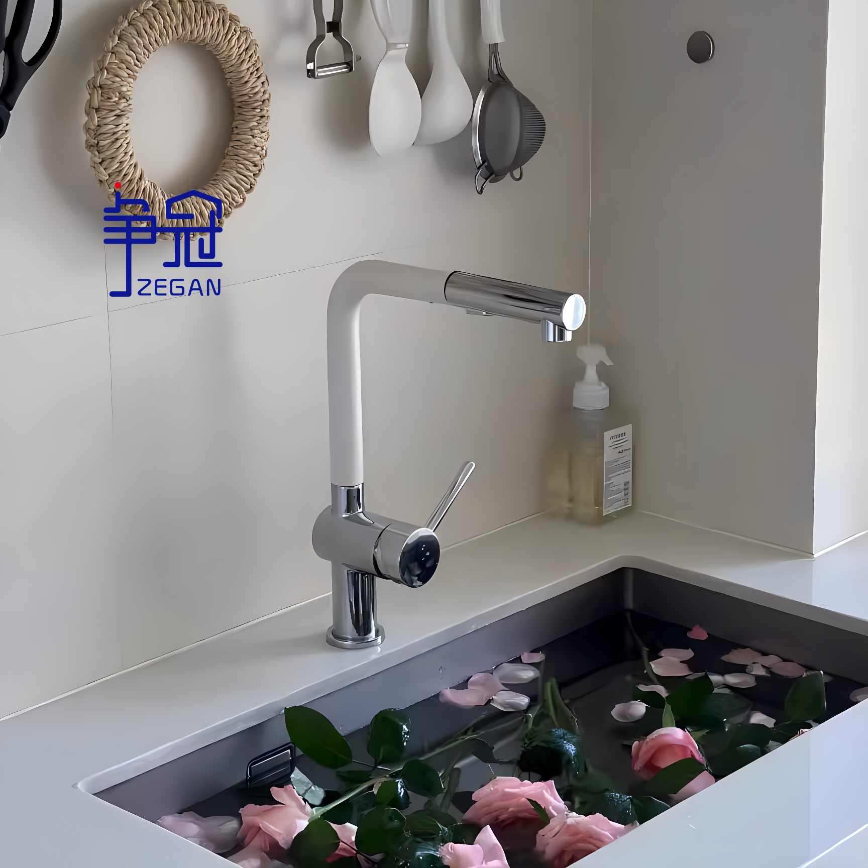 日式奶白三合一水龙头厨房洗菜盆水槽三用多功能净水抽拉龙头冷热
