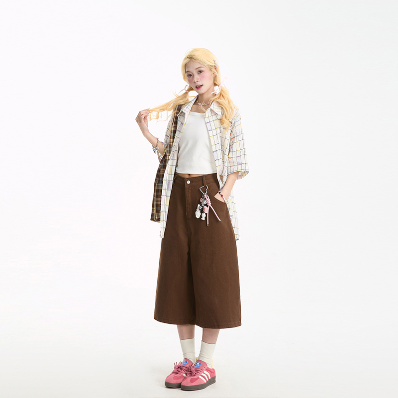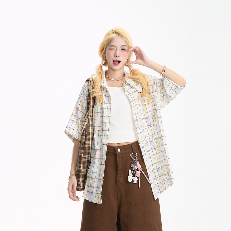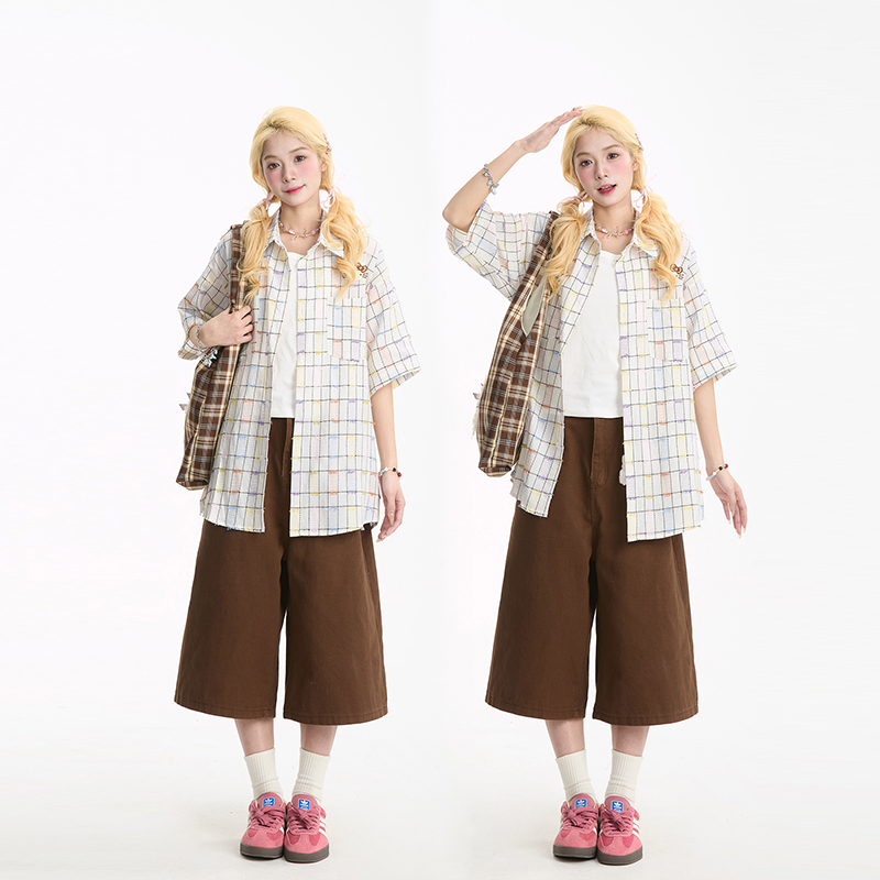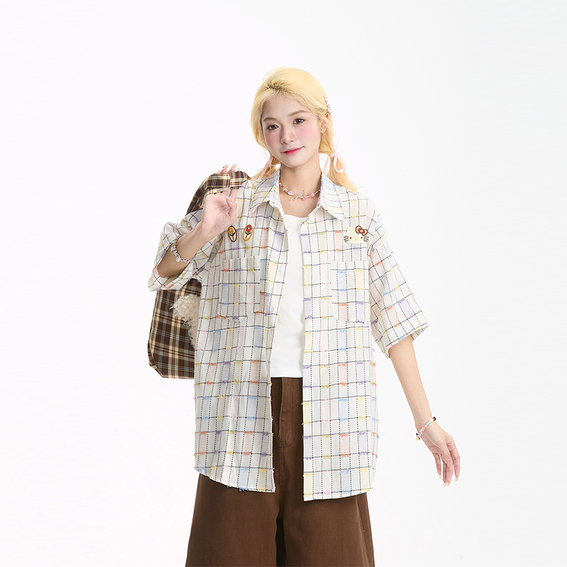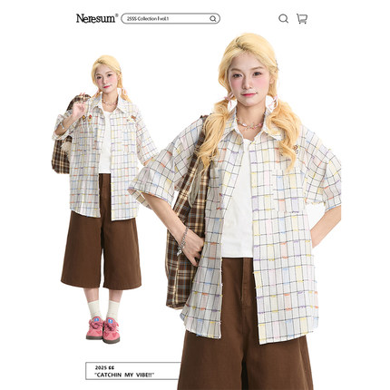 NERESUM卡通猫咪刺绣格子短袖衬衫女设计感夏季宽松百搭情侣衬衣
