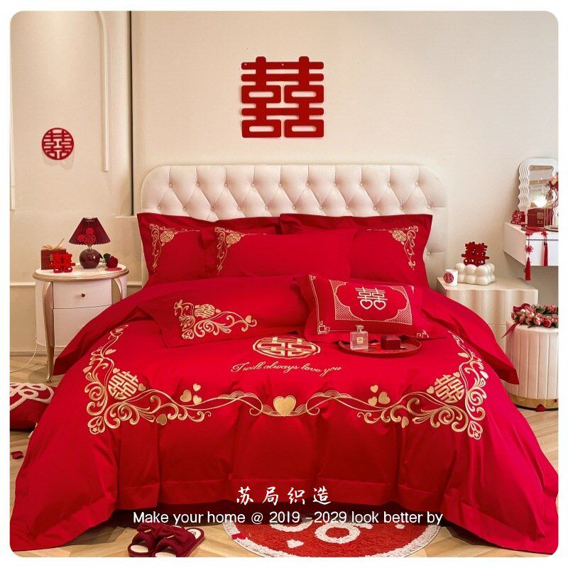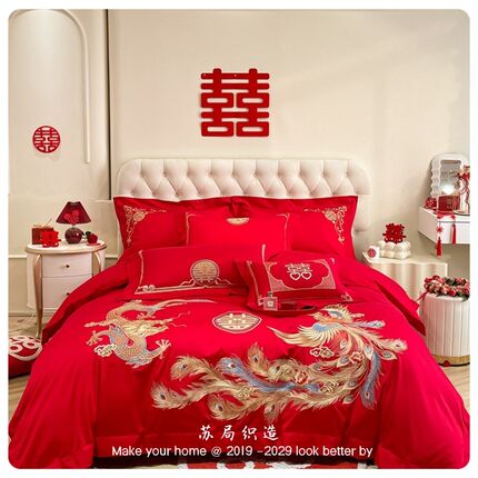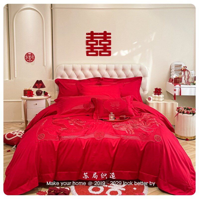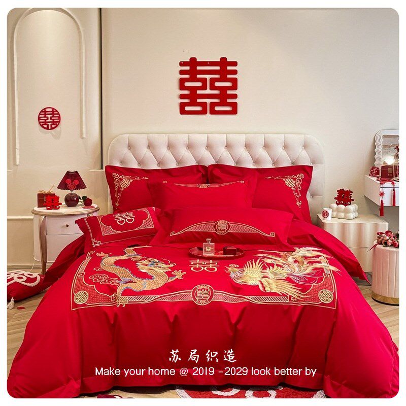 中式龙凤刺绣结婚床上用t品四件套婚庆红色喜庆高级感喜被床单