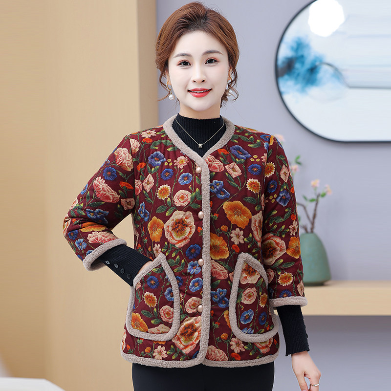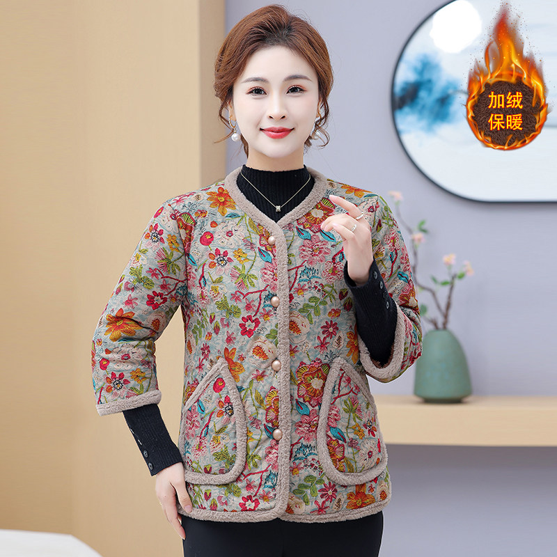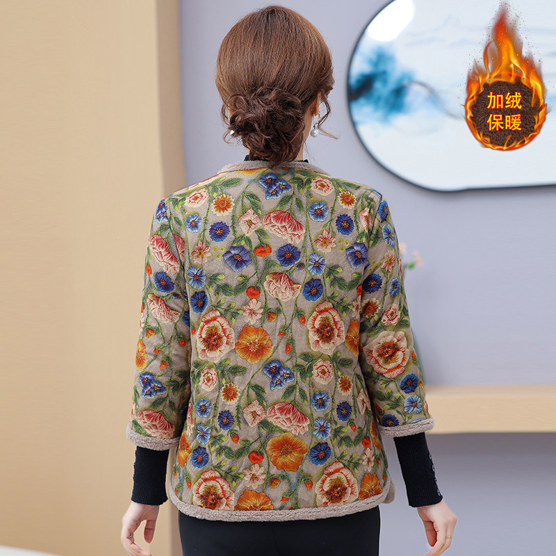 妈妈秋冬季七分棉衣加绒加厚保暖碎花棉服外套中老年女装中袖棉袄