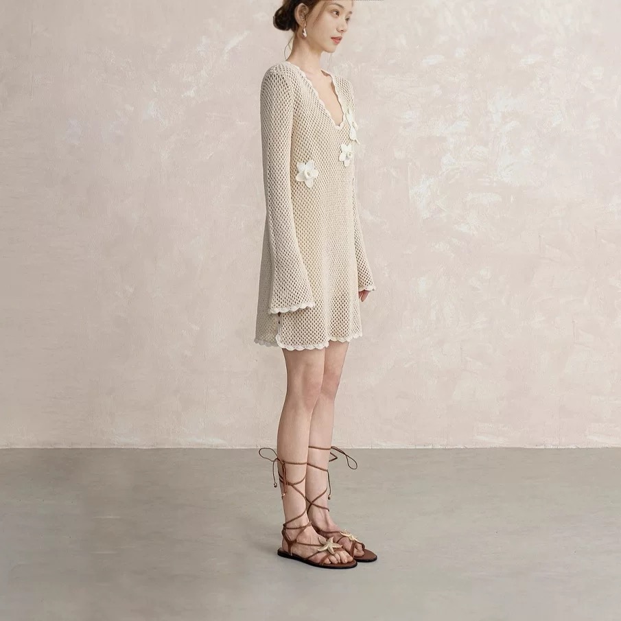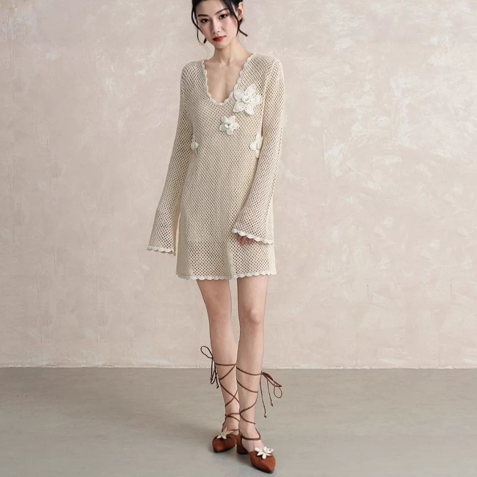 法式深U领镂空针织连衣裙女夏季慵懒宽松显瘦裙子
