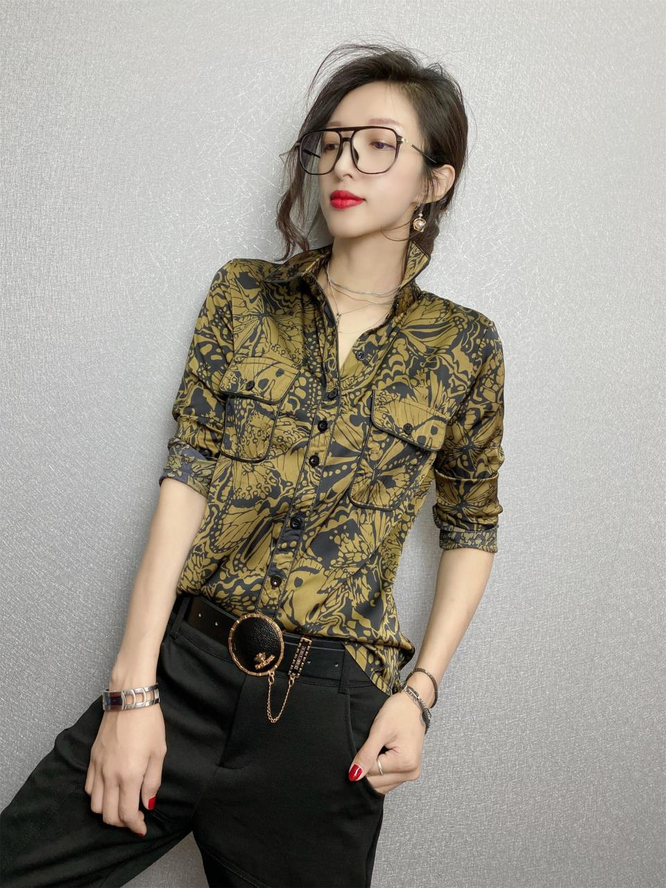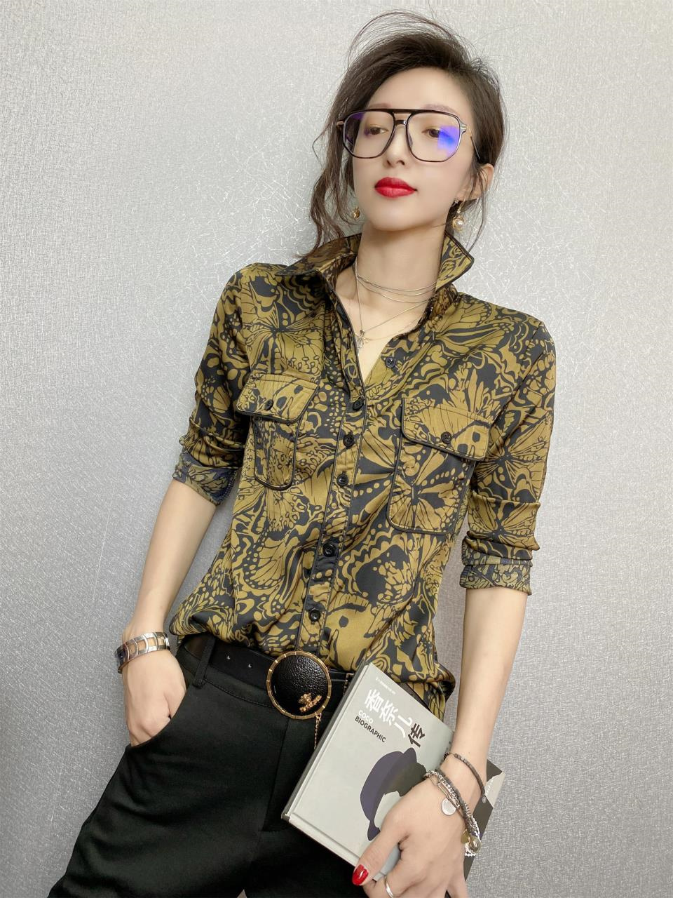 方领长袖丝滑碎花衬衫女时尚秋冬新品百搭单排扣通勤韩版修身上衣