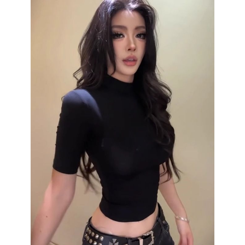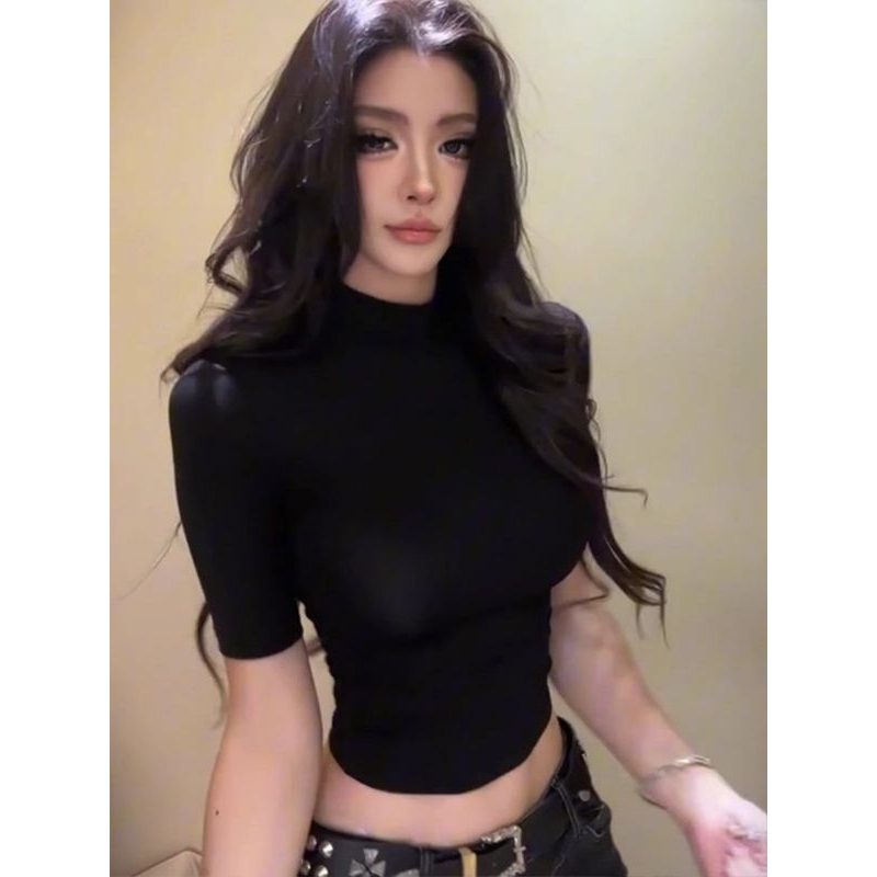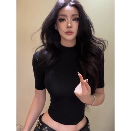 黑色半高领正肩半袖T恤女打底衫内搭春秋夏新款辣妹紧身短款上衣