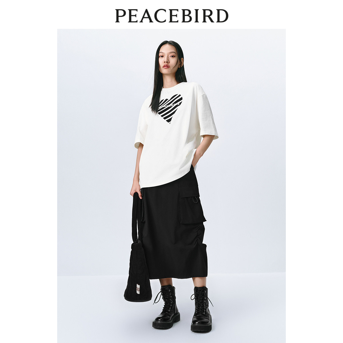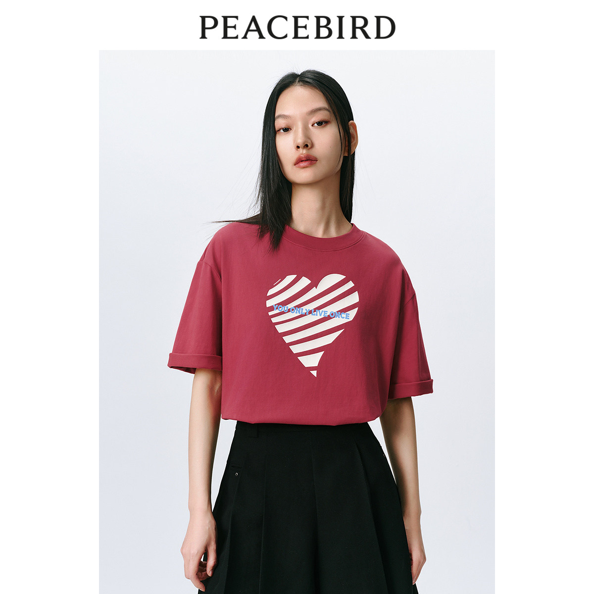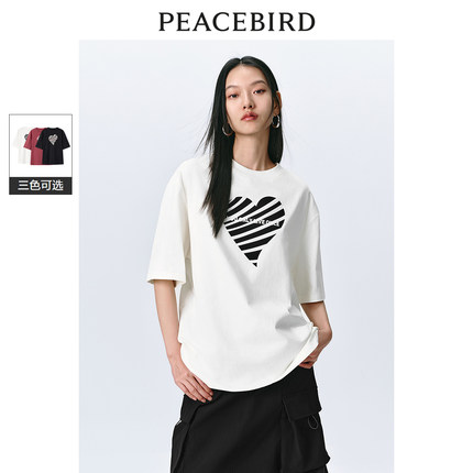 太平鸟爱心撞色印花短袖T恤女2025秋新款宽松洋气圆领纯棉上衣潮