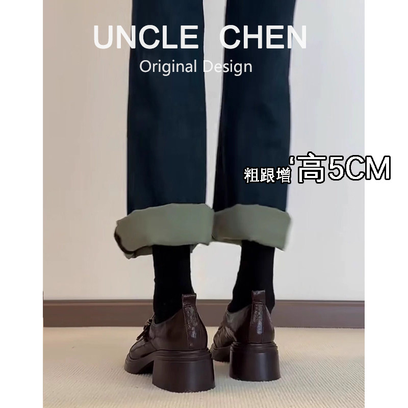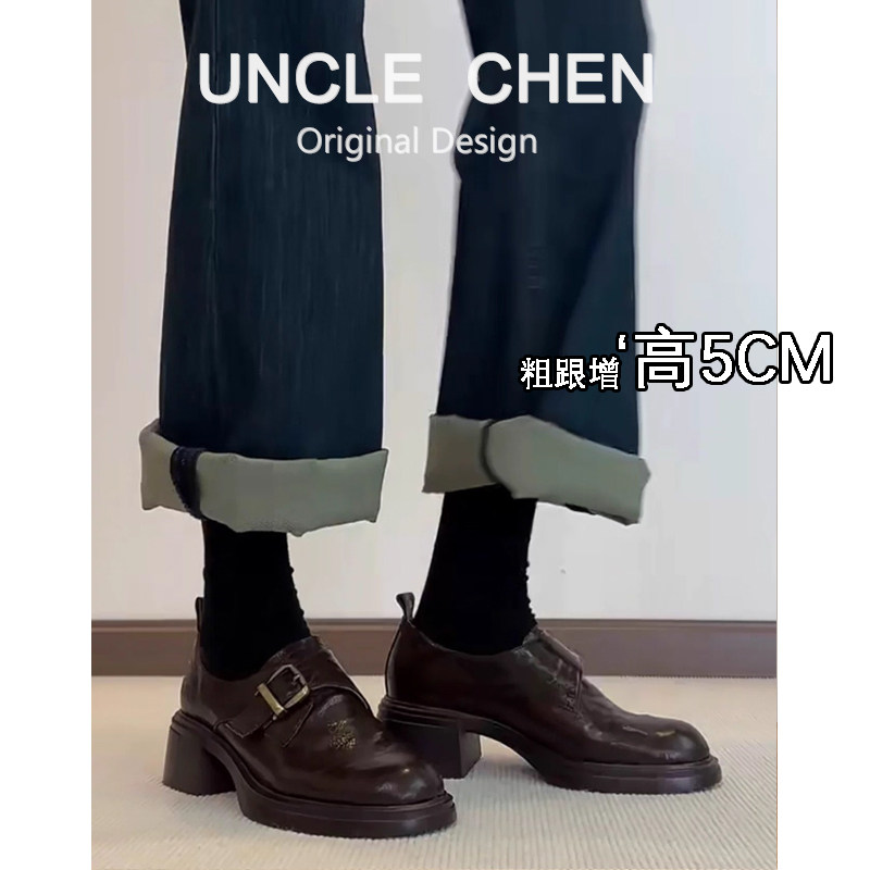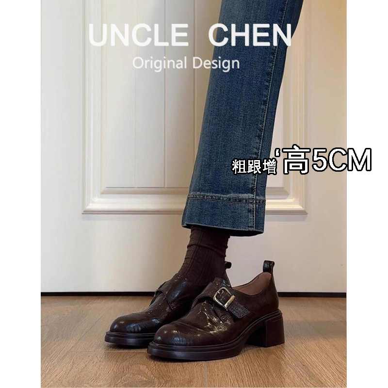 羊皮版~圆头皮带扣小皮鞋女2025年粗跟学院风乐福鞋懒人棕色单鞋