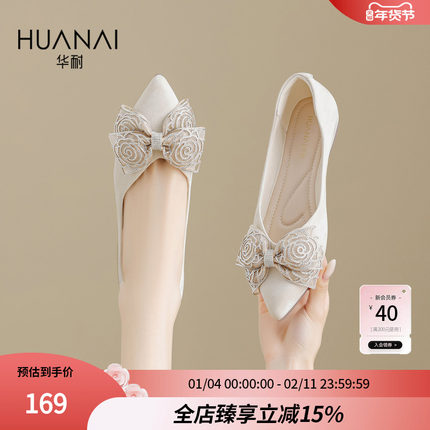 华耐尖头浅口单鞋女2025新款春秋蝴蝶结内增高平底鞋通勤法式女鞋