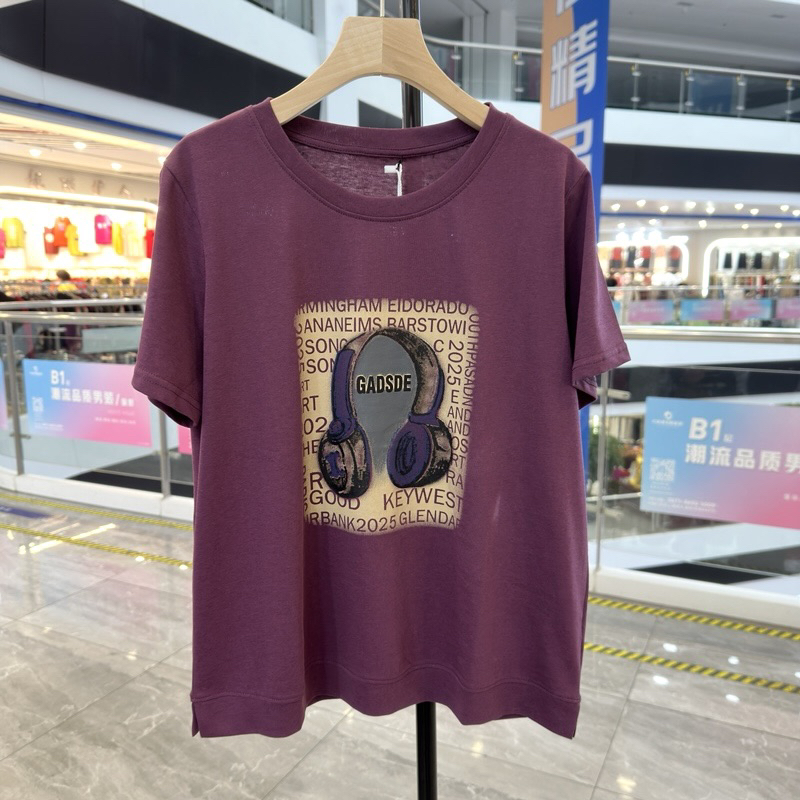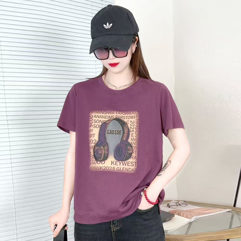 时尚妈妈装圆领耳机印花短袖T恤女宽松显瘦百搭减龄遮肉上衣体恤