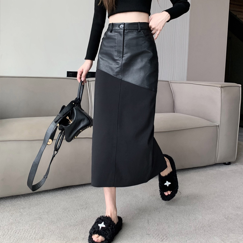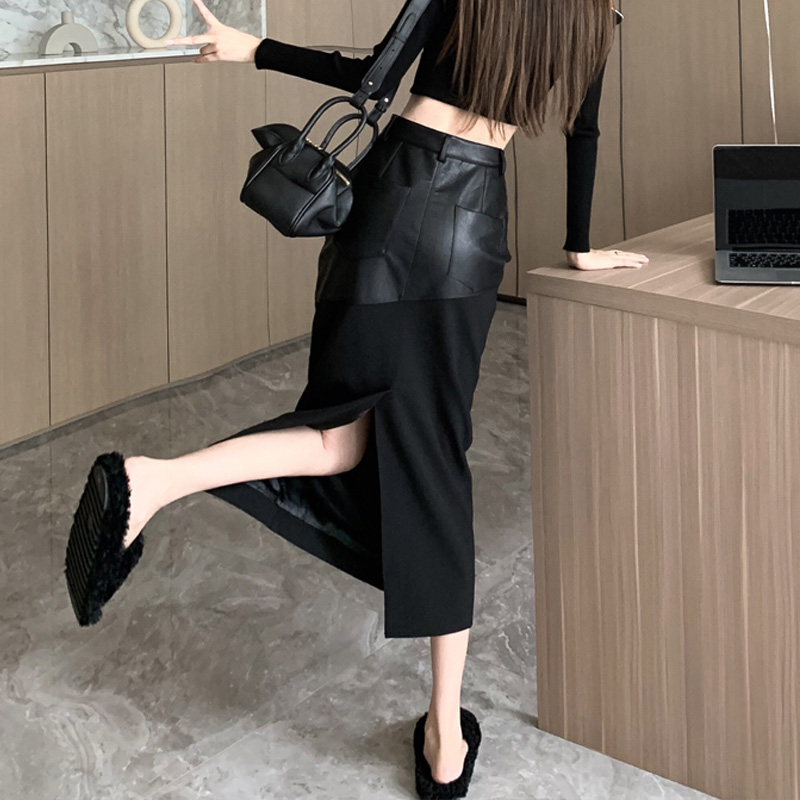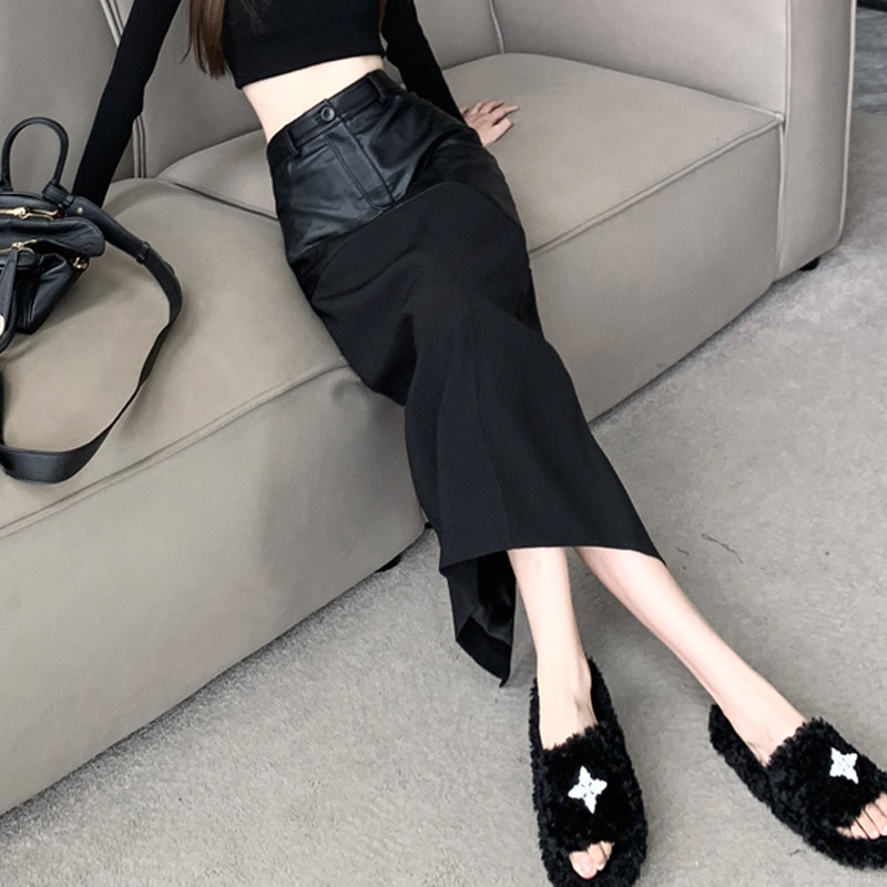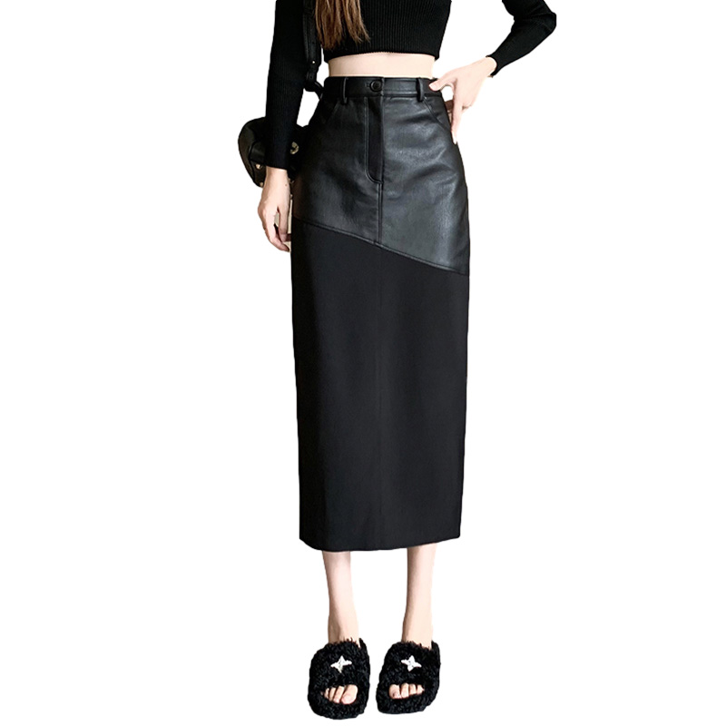 黑色高腰皮裙半身裙女秋季a字开叉包臀裙小个子中长款职业直筒裙