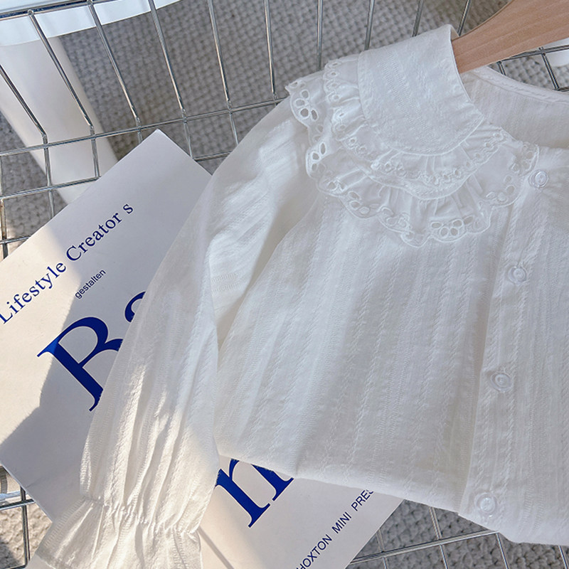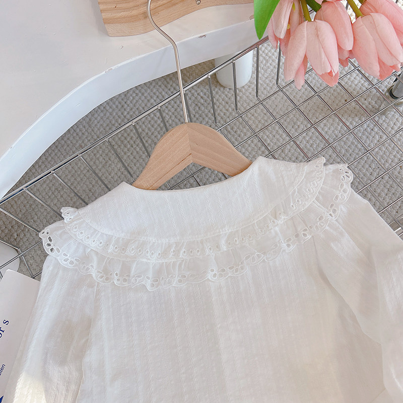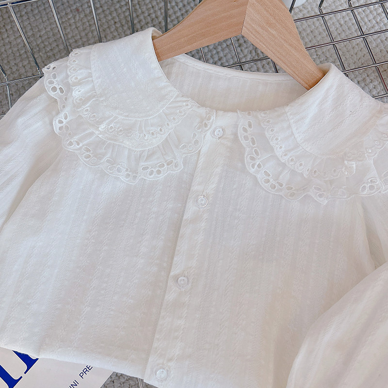 女童衬衫衬衣新款纯棉春秋长袖双层娃娃领蕾丝边洋气翻领上衣