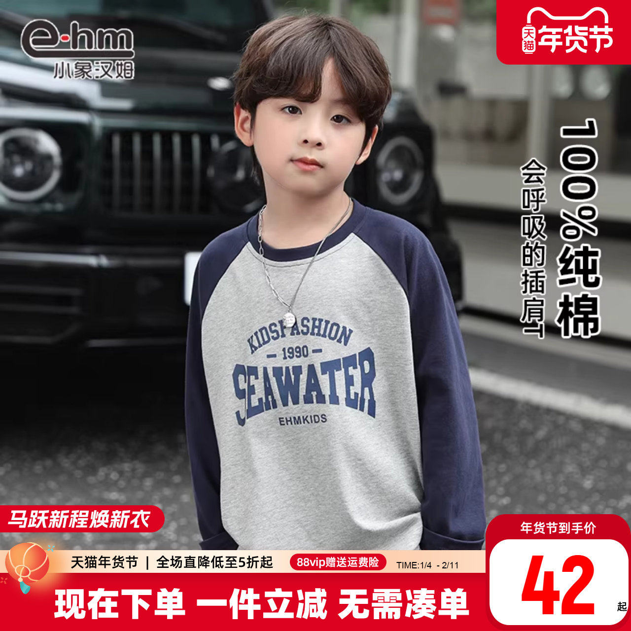 小象汉姆童装男童长袖T恤纯棉打底衫2025秋装拼接中大童-5A抗菌