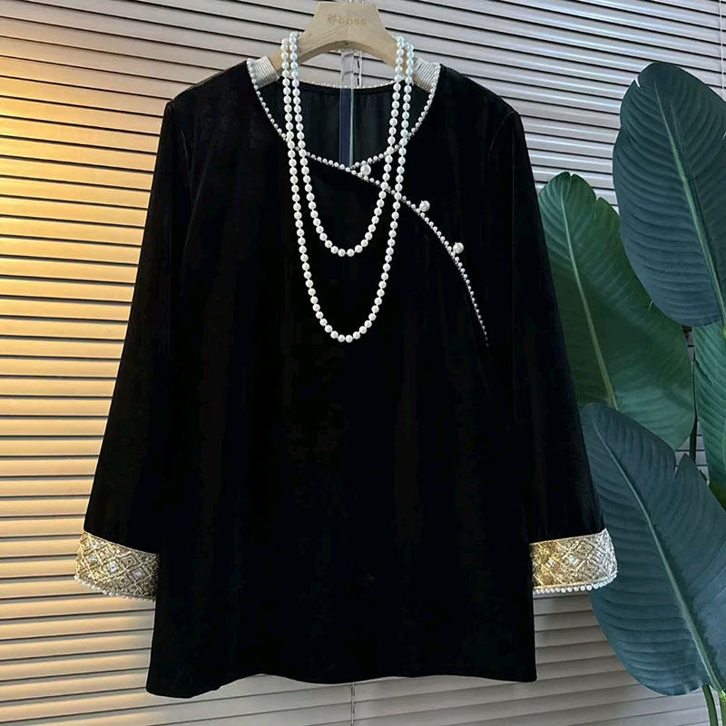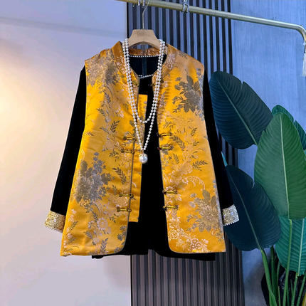 新中式复古马甲提花大码女装2025秋季新款胖妹妹丝绒钉珠上衣打底