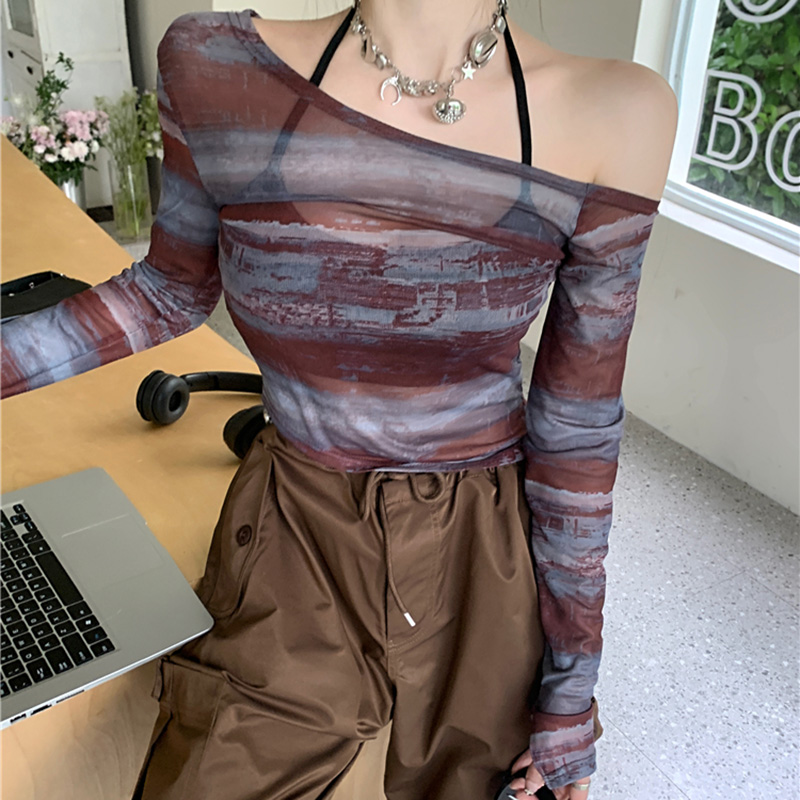 纯欲风撞色露肩长袖T恤女夏修身显瘦短款打底衫上衣辣妹卡腰小衫