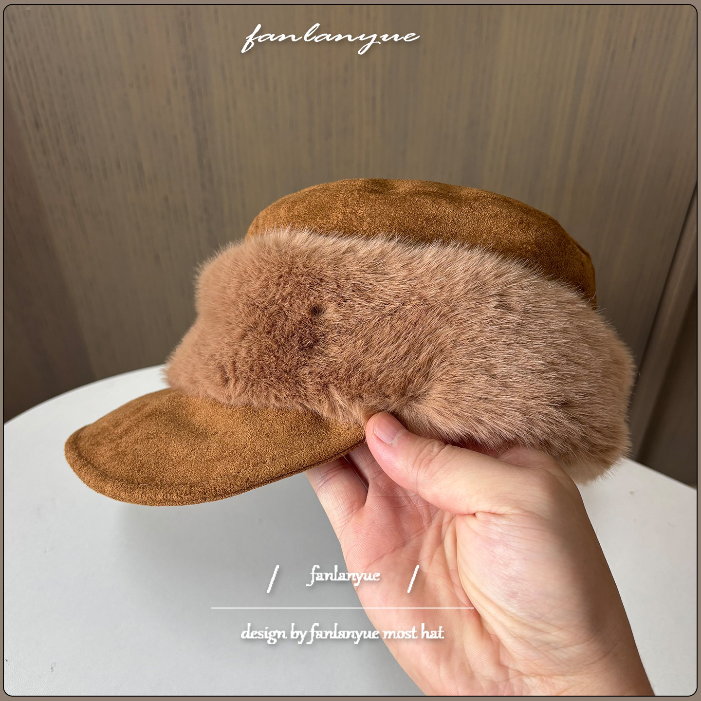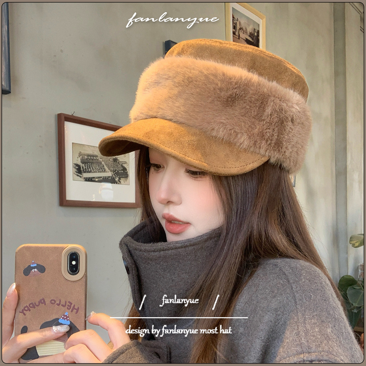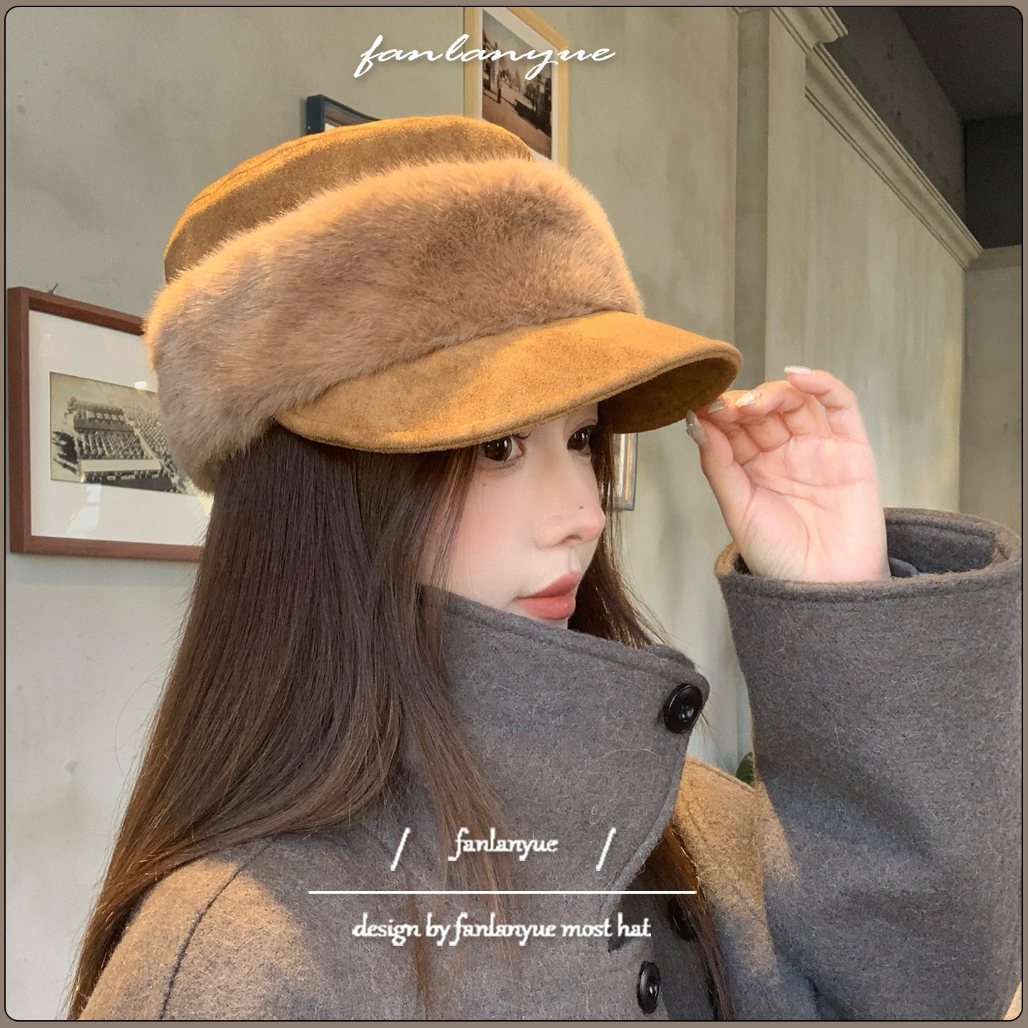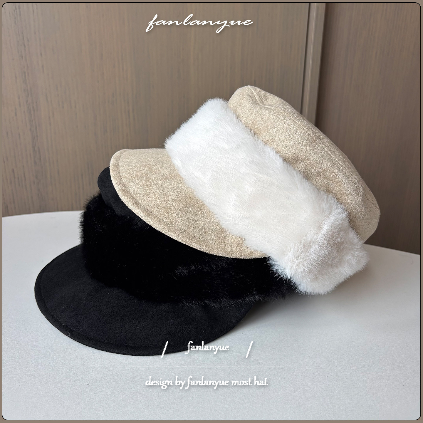 复古毛绒拼接麂皮绒平顶报童帽女秋冬显脸小马术帽潮酷个性鸭舌帽
