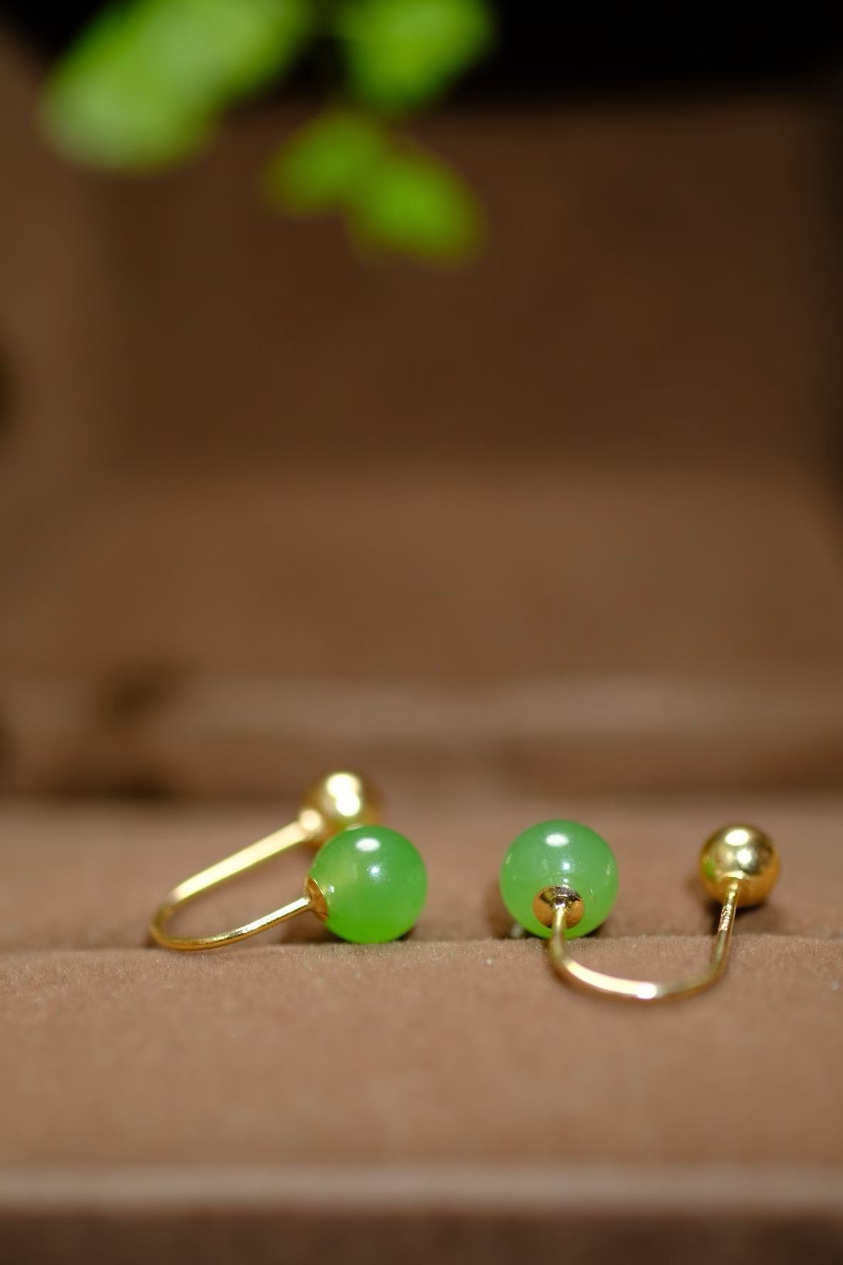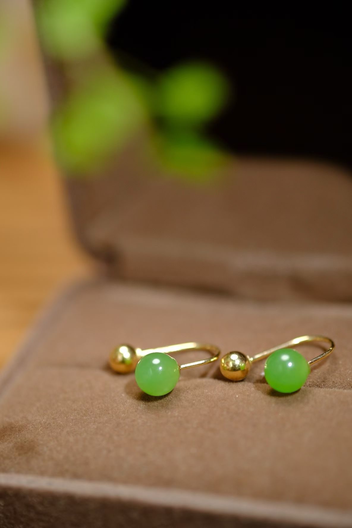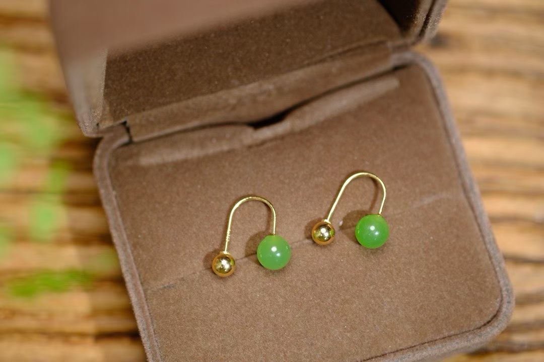 和田玉碧玉圆耳钉U形金耳钉18金镶冰低绿色珠设计款金耳钉送女友