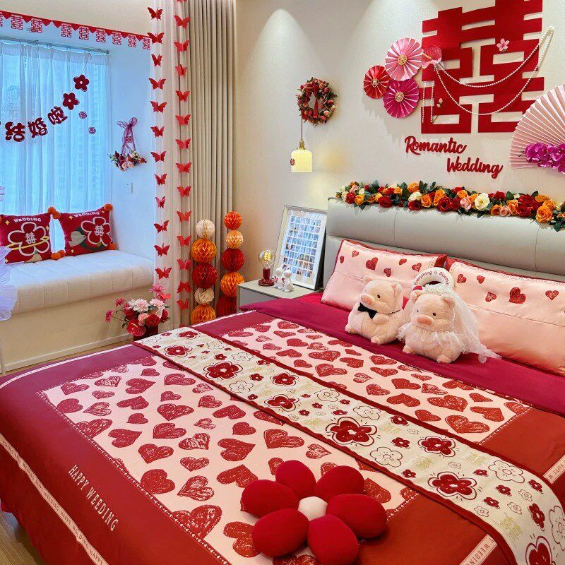 中式全棉爱心结婚四件套大红色床单被套L婚庆床上用品婚房喜被