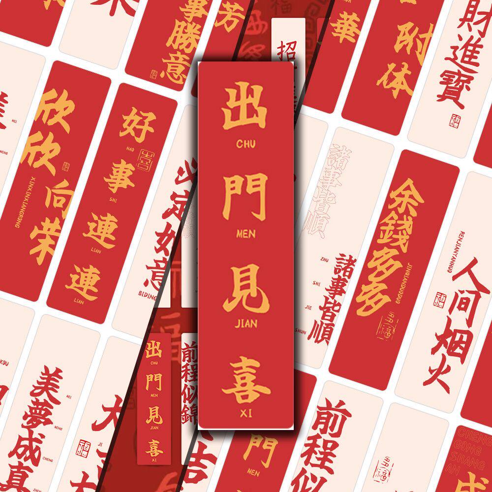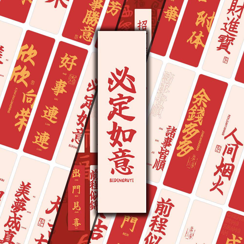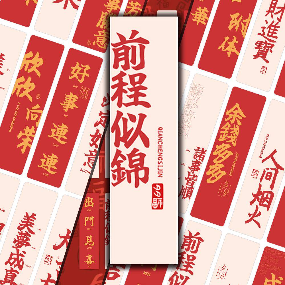 48张国潮红色喜庆烫金书签好运文字励志手写纸质祝福书签书籍盒装
