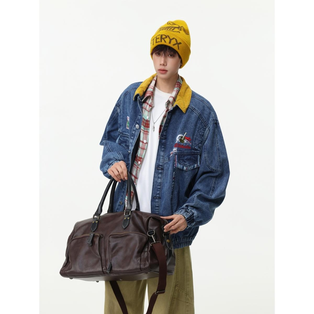 美式复古拼接刺绣大口袋牛仔外套男女宽松撞色翻领夹克百搭情侣
