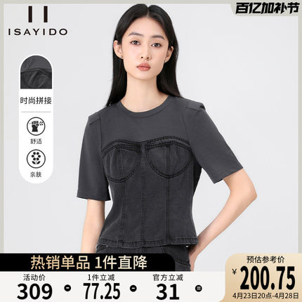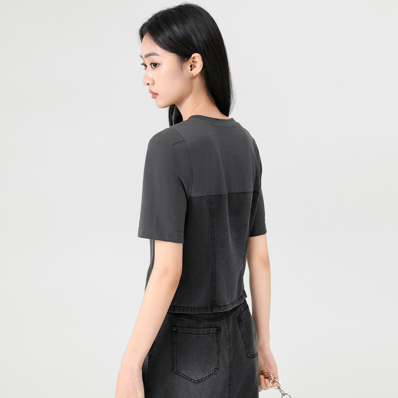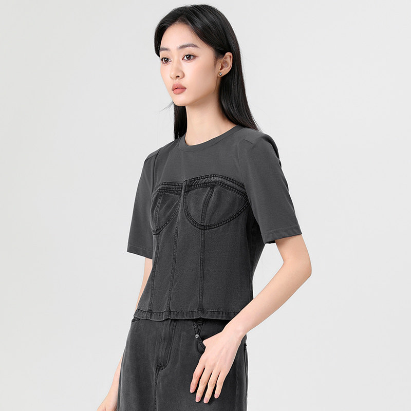 傲丝度圆领短袖T恤女夏季轻薄百搭小衫小个子时尚拼接辣妹风上衣