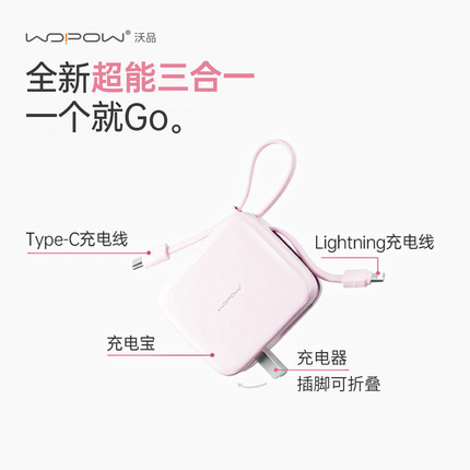 【国家3C认证】WOPOW沃品小方糖三合一充电宝带插头自带线快充10000毫安轻小巧便携迷你原版移动电源2025新款
