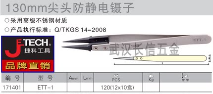 捷科JETECH不锈钢防静电镊子电子尖头弯头宽头镊子ETT-1/2/3