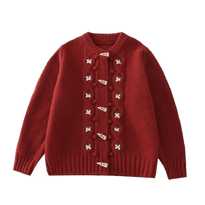 日系复古刺绣牛角扣开衫毛衣秋冬