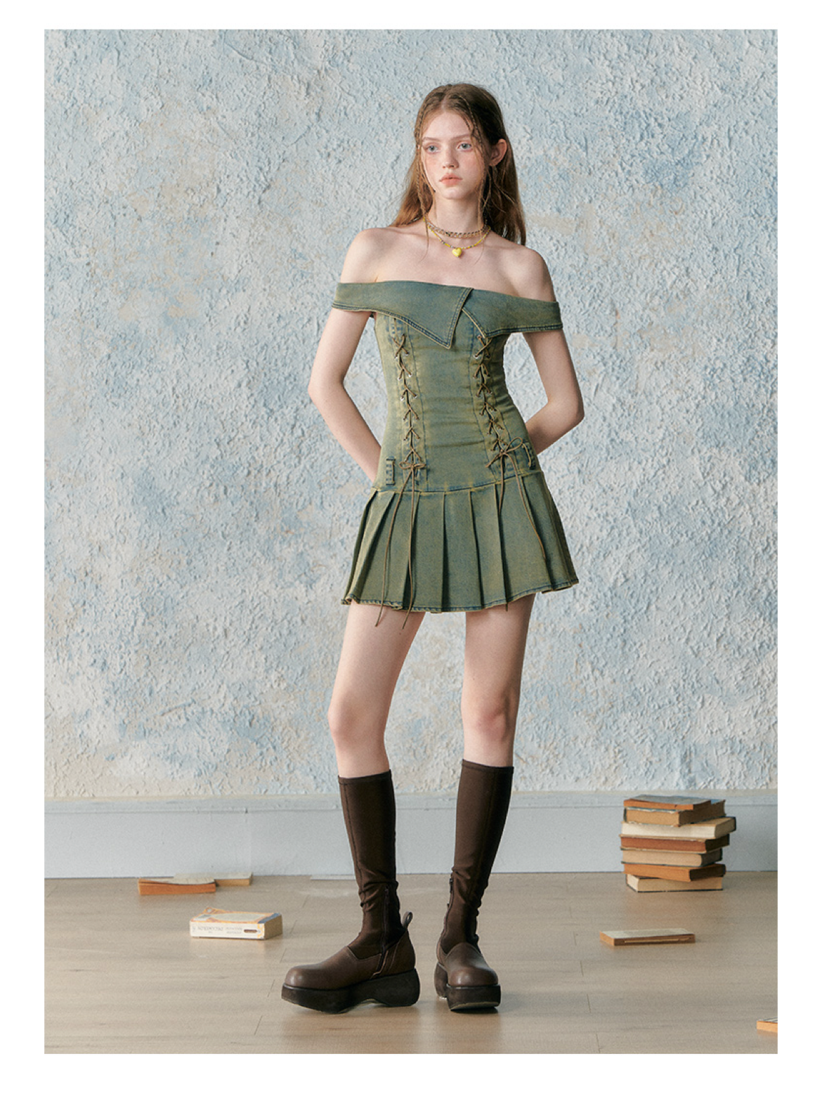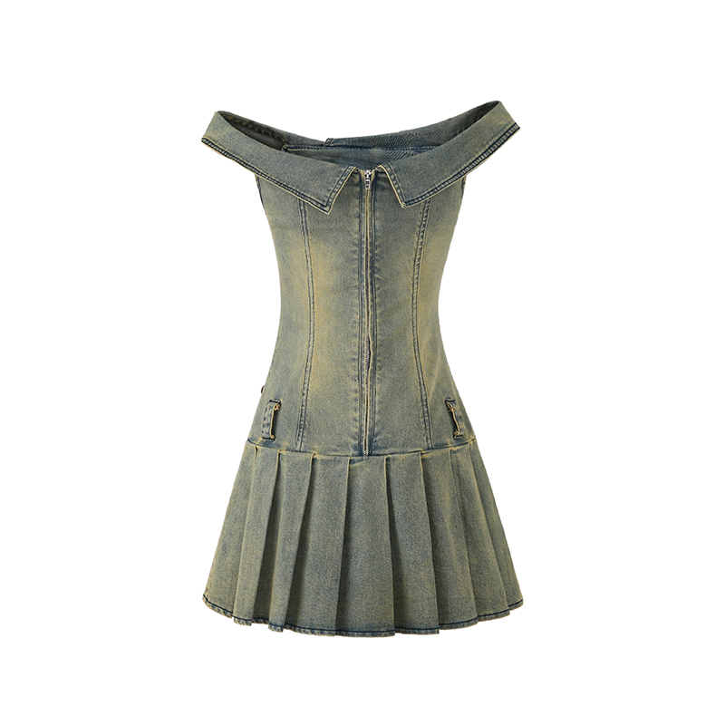 牛仔连衣裙辣妹一字肩收腰显瘦设计感复古气质高级感抹胸百褶短裙