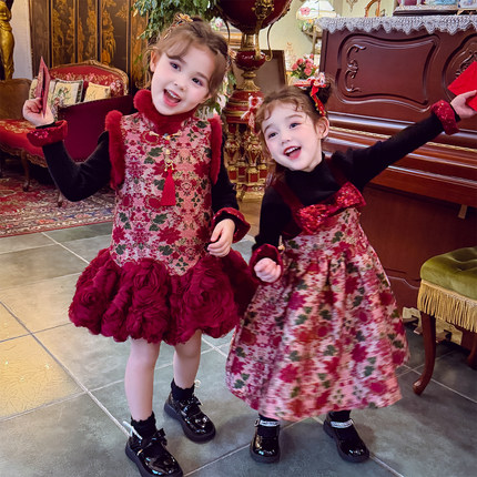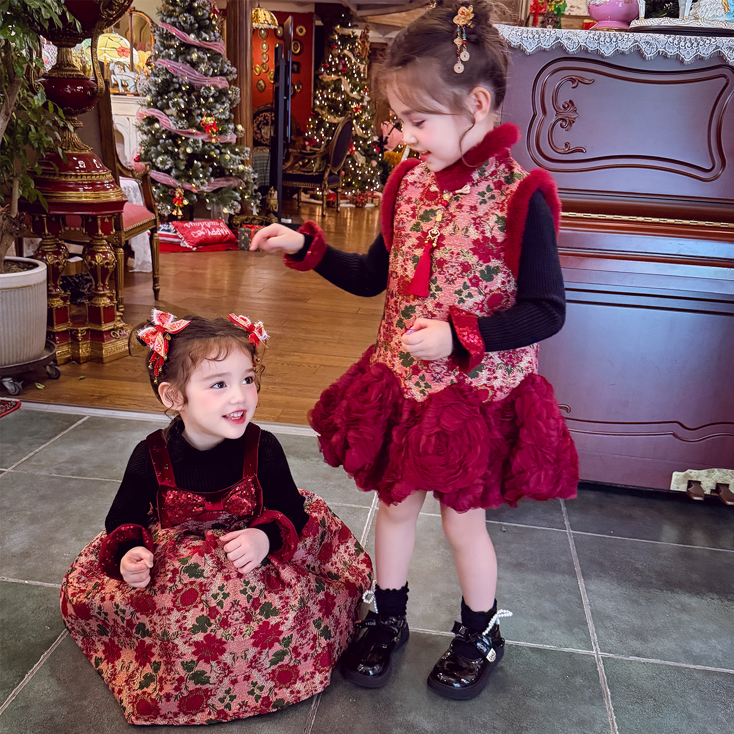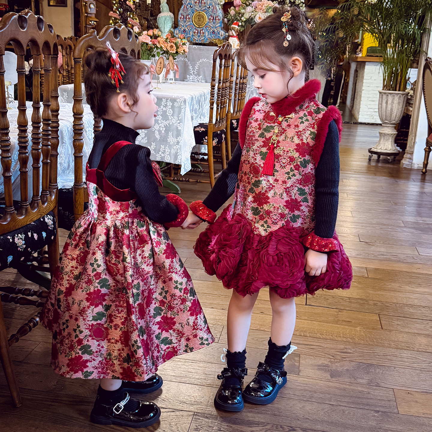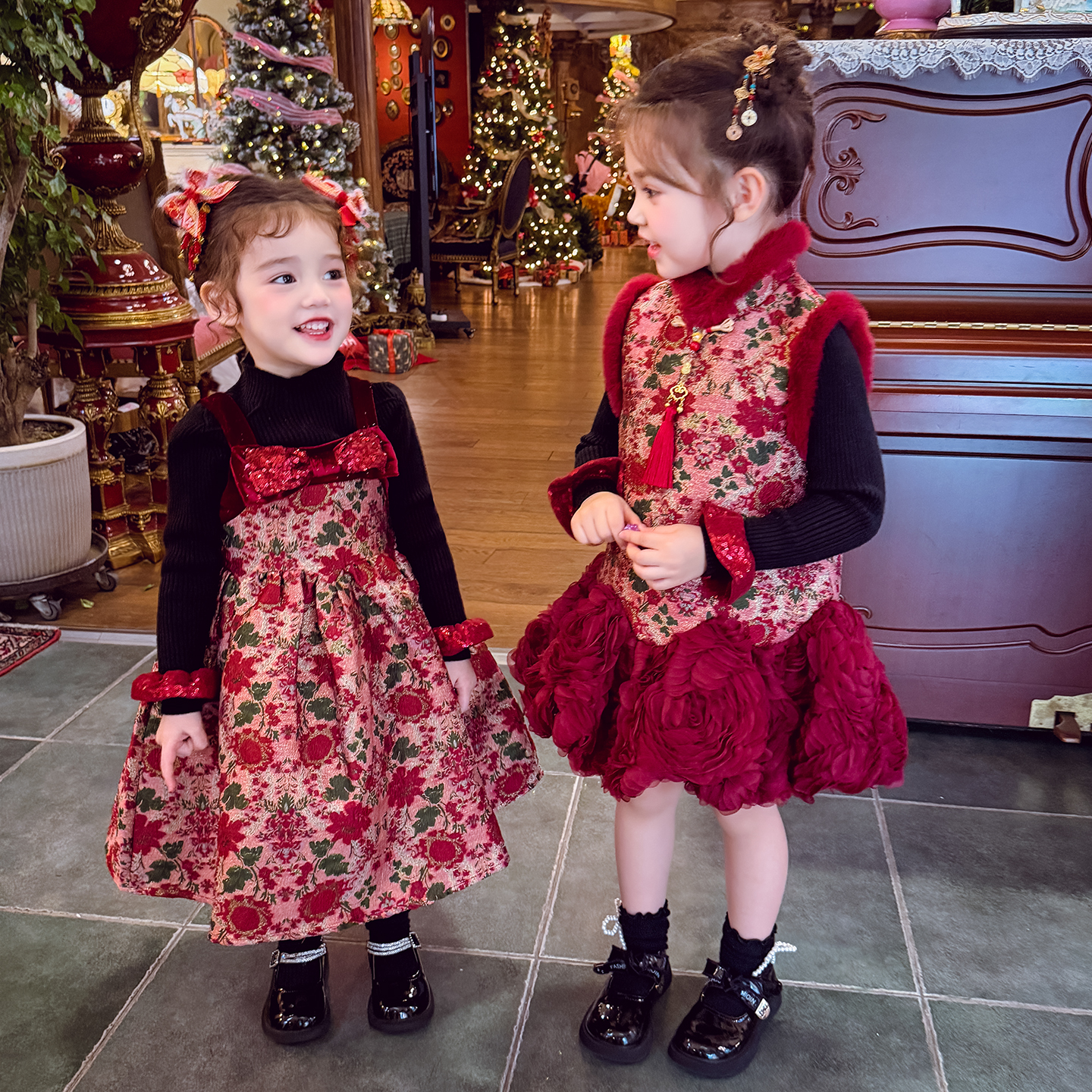 女童连衣裙冬装2025新款洋气儿童碎花背心公主裙小女孩加绒礼服裙