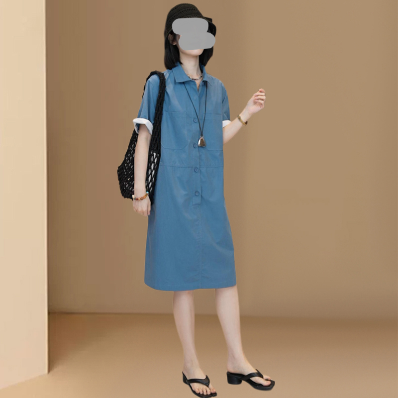 法式小香风短袖工装连衣裙女夏季小个子时尚宽松显瘦百搭中长裙潮