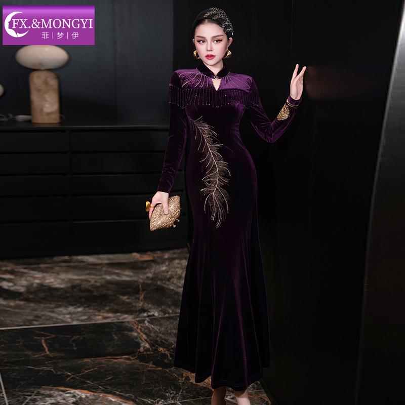 菲梦伊钉珠红色连衣裙女秋装新款新中式国风复古金丝绒改良旗袍裙
