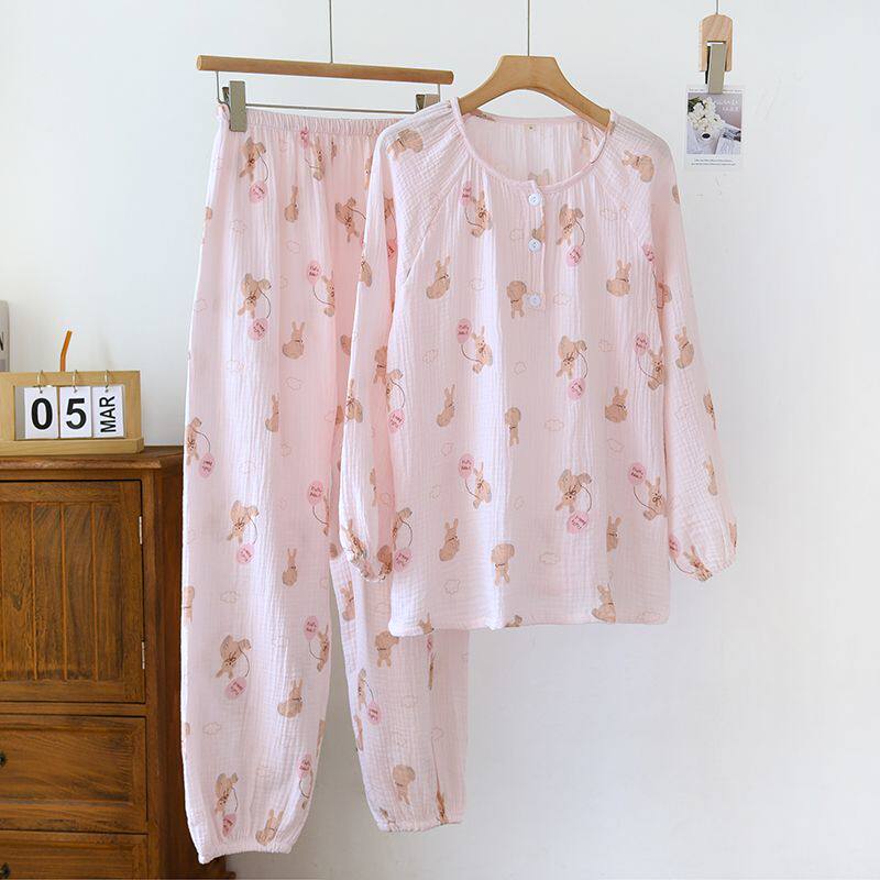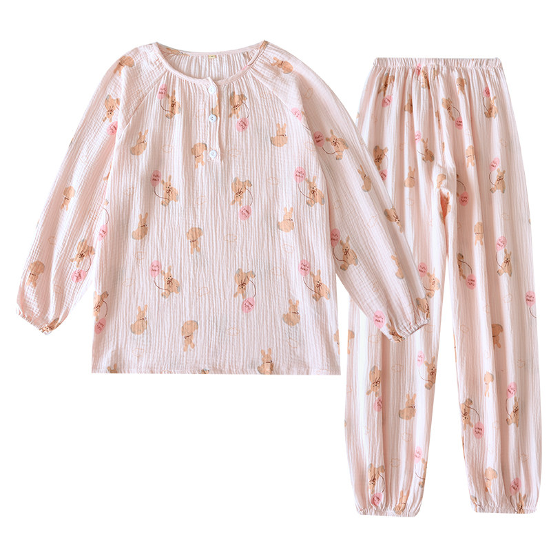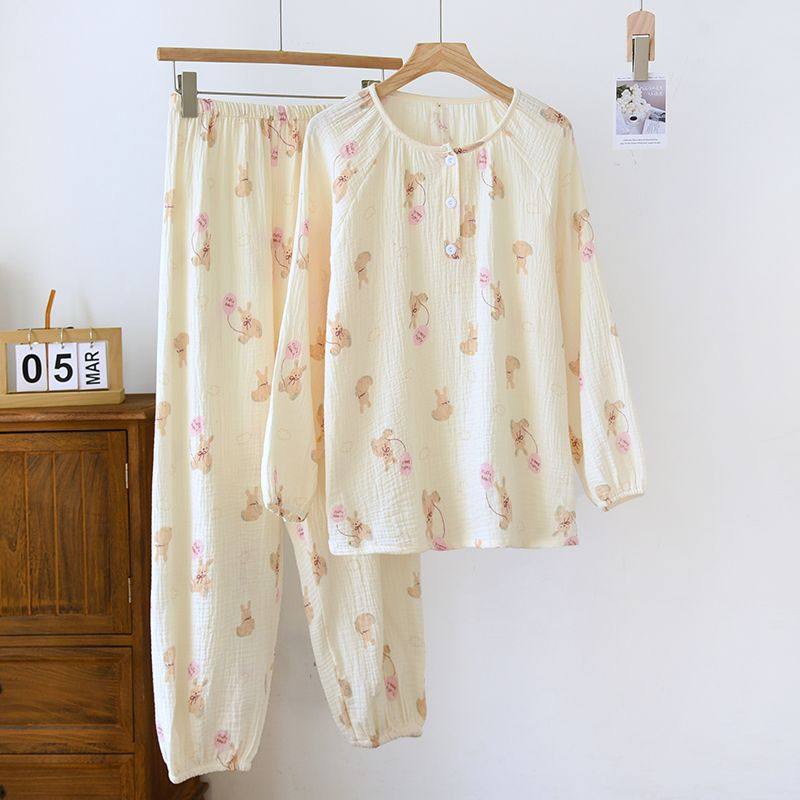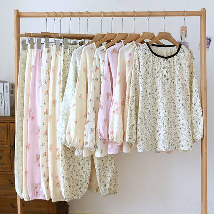 春夏季女士睡衣纯棉双层纱布薄款长袖套头宽松大码家居服两件套装