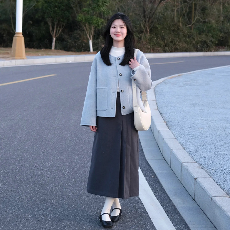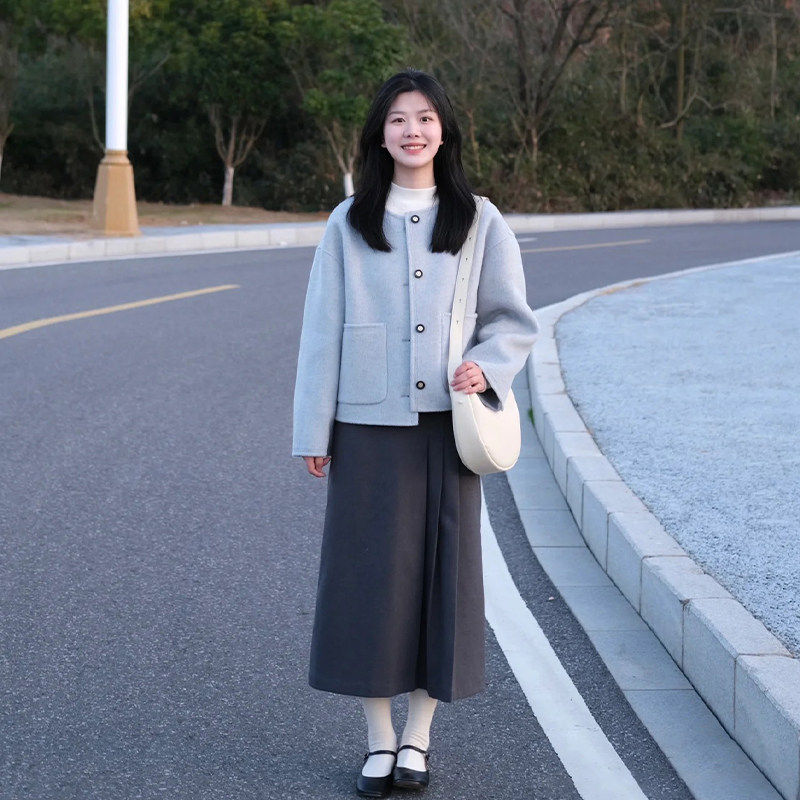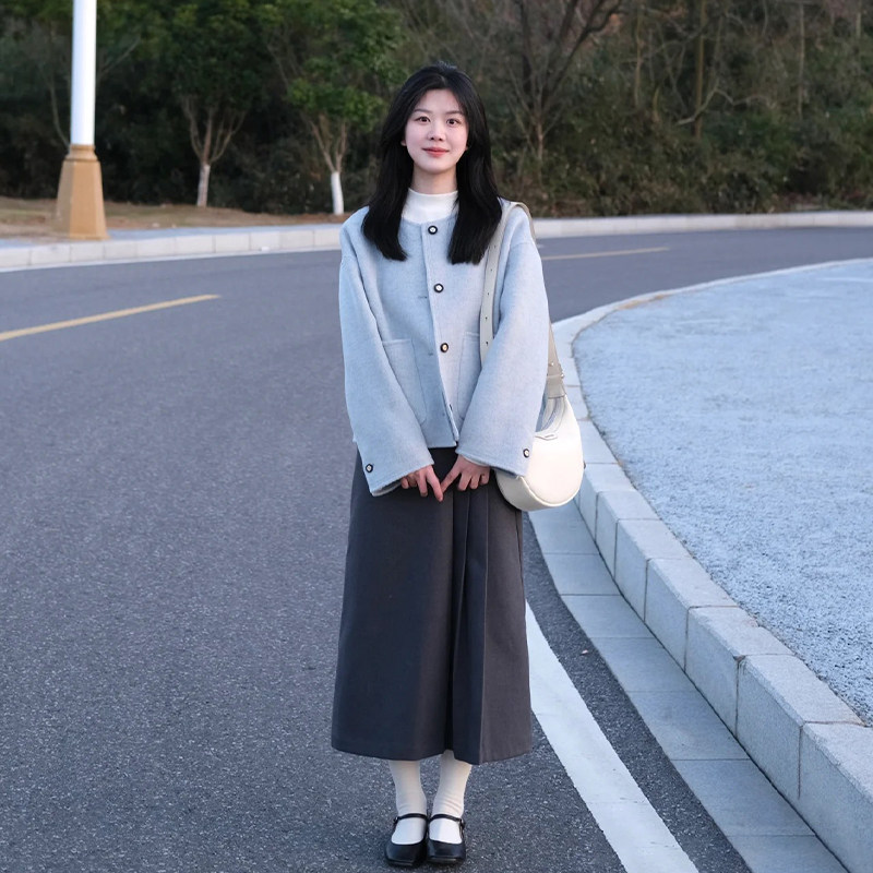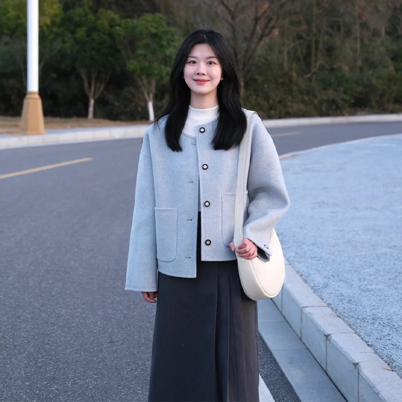 高级感温柔风蓝色毛呢外套女春秋新款韩版小个子宽松显瘦短款上衣