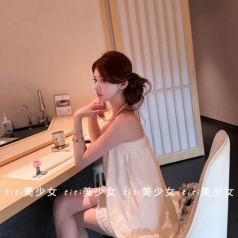 【TiTi美少女】小白花挂脖连衣裙纯欲白色蕾丝薄缎面宽松短裙